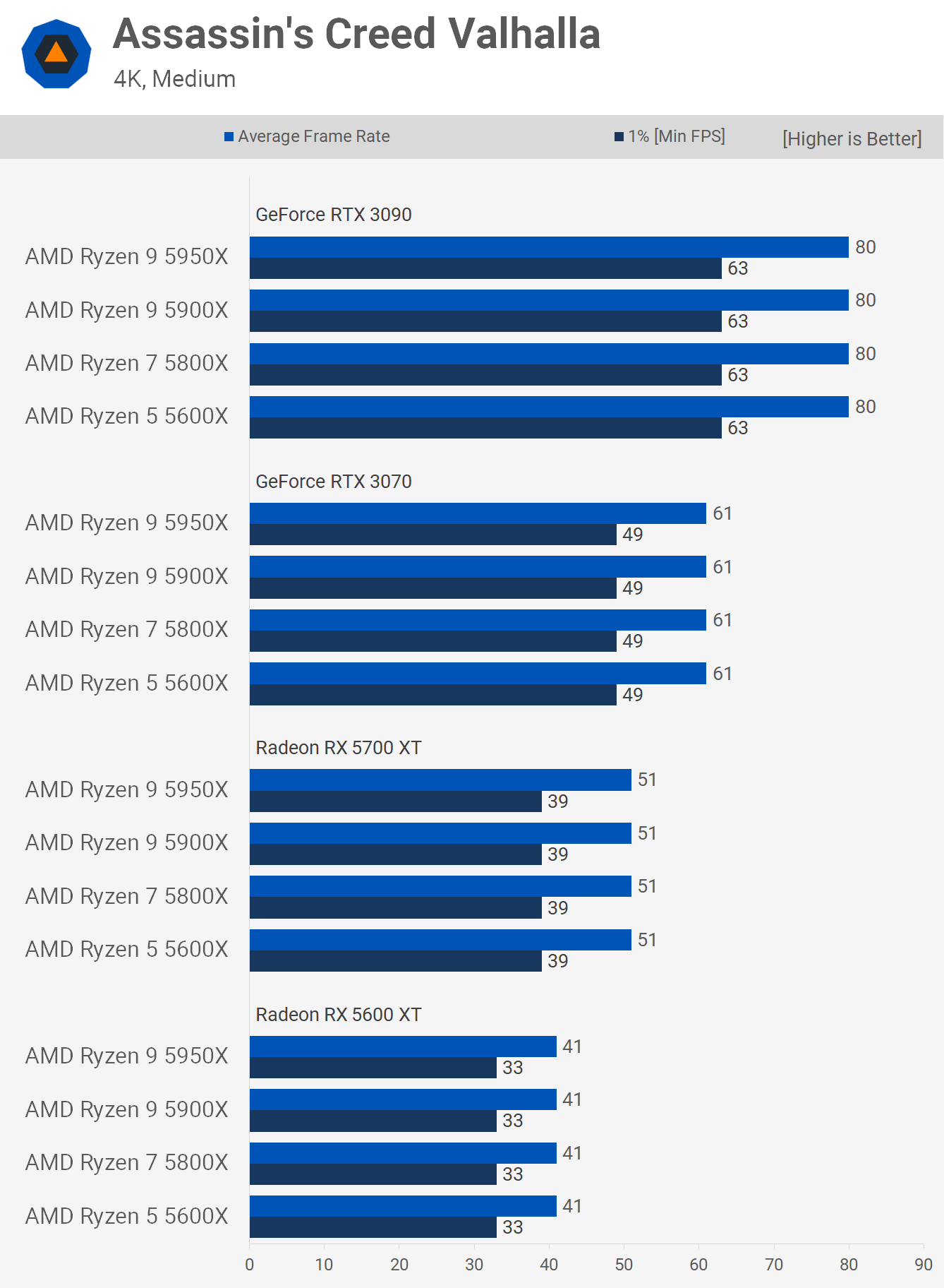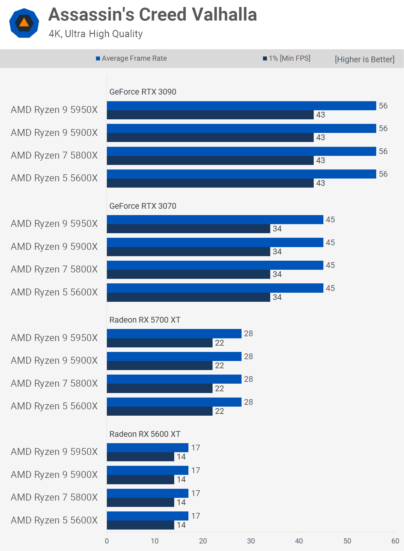 Typically, Assassin's Creed titles are very CPU demanding and AC Valhalla is not an exception, though if you have a CPU as capable as the 5600X, then that's all you'll need. Previous Assassin's Creed titles were known to break quad-core CPUs (4-cores/4-threads), but they've always played well on 12-thread processors.