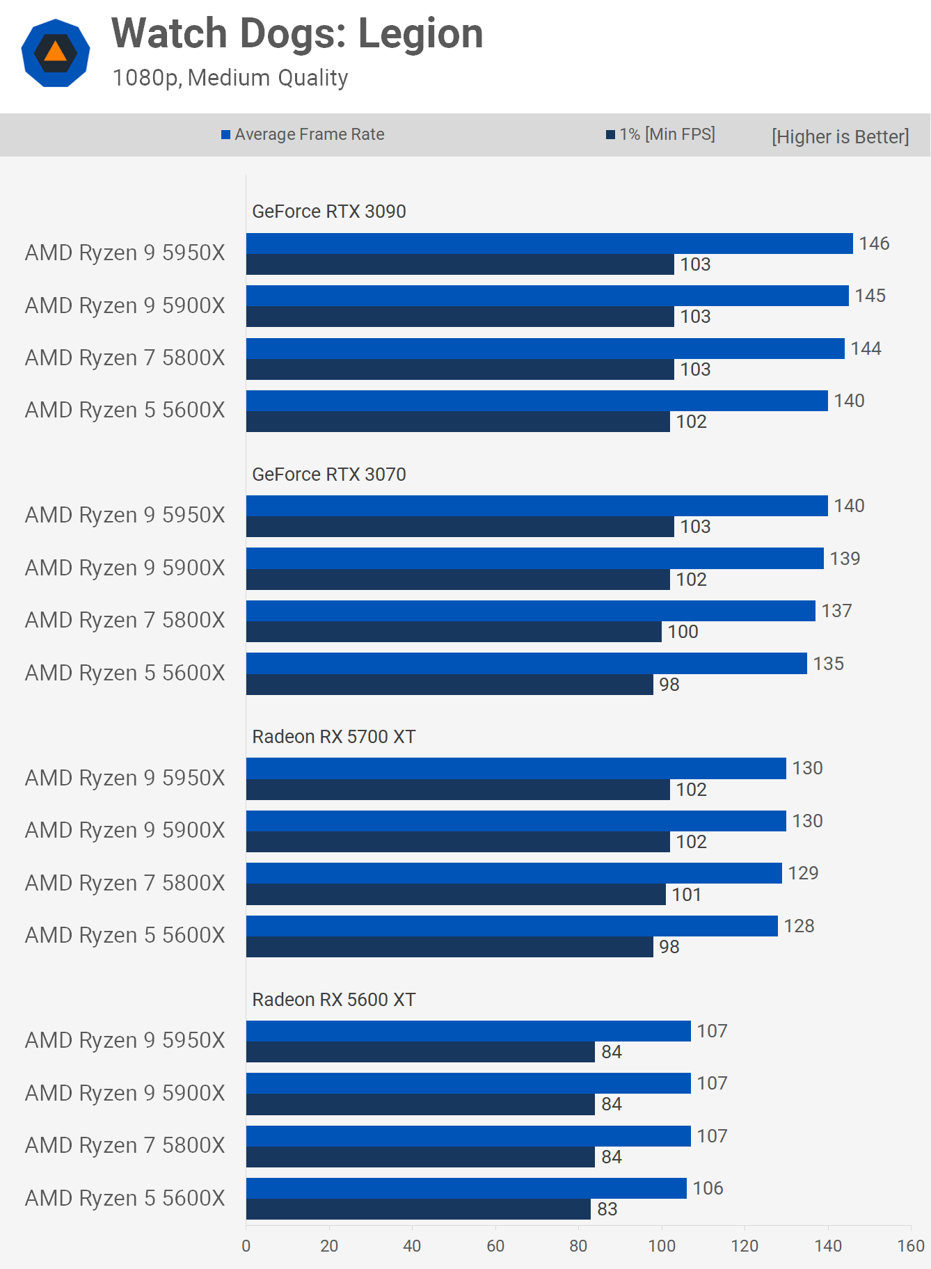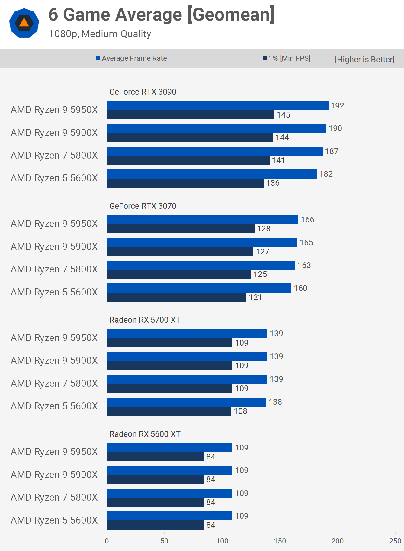 The margins grow quite considerably when lowering the visual quality settings to medium as the 5950X is up to 18% faster than the 5600X and quite interestingly that was seen with the RTX 3070, though we're only talking about a 7% difference when comparing the average frame rate. It's worth noting that once we dropped down to the 5700 XT that all four Zen 3 processors delivered the same level of performance.