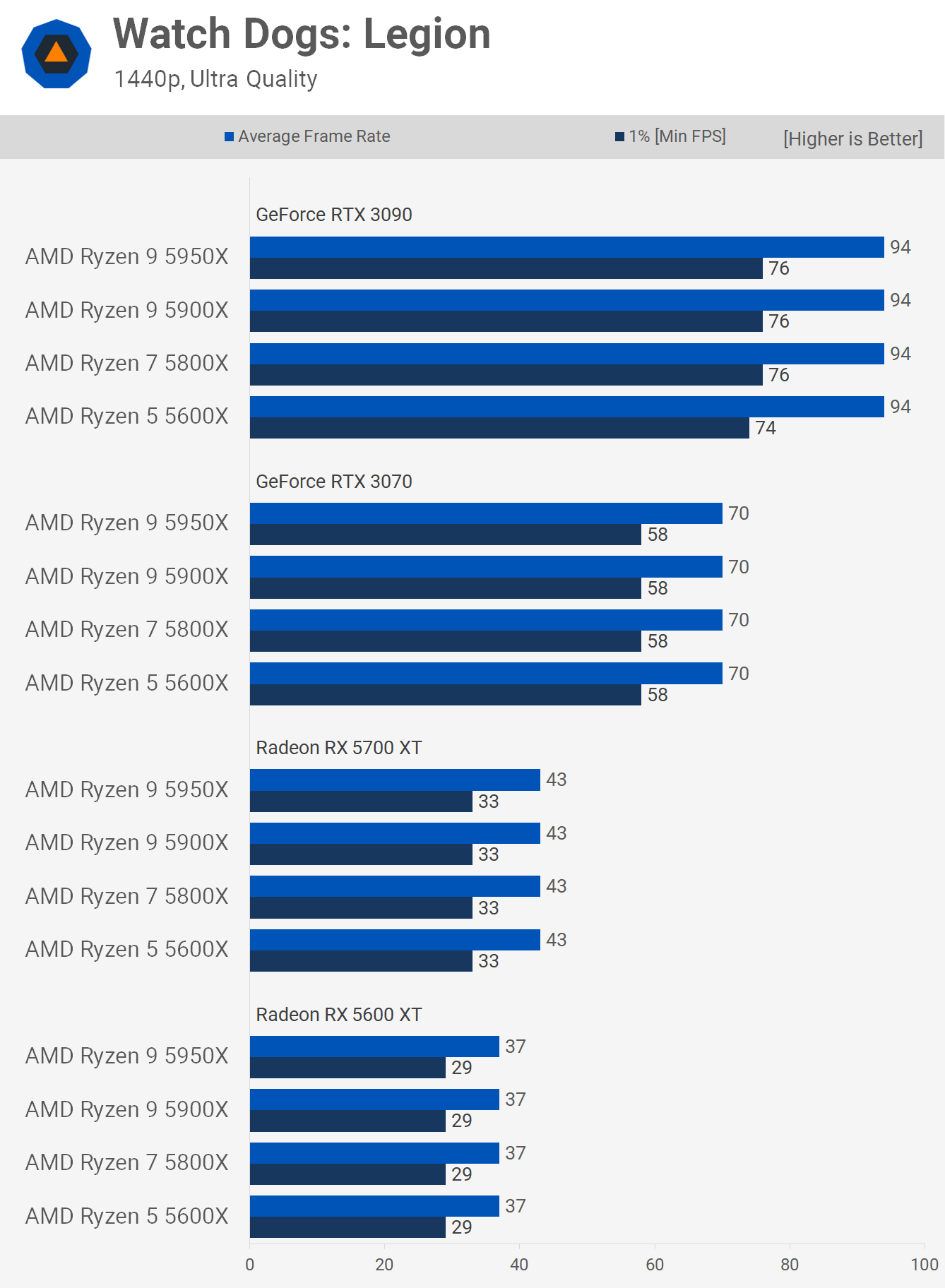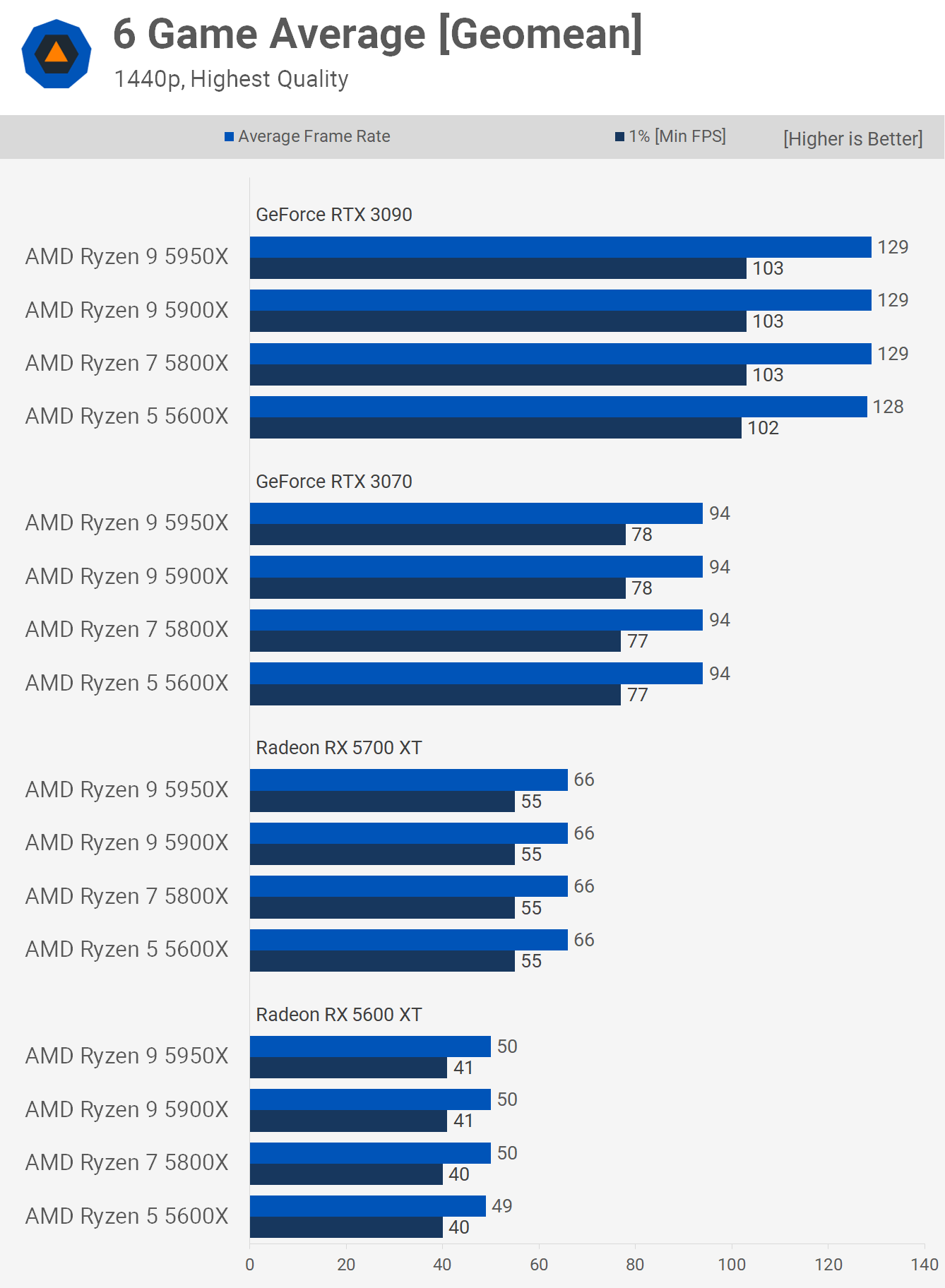 Moving up to 1440p using ultra quality settings you'll typically not see a difference in performance between the 5600X, 5800X, 5900X and 5950X, certainly nothing worth worrying about.