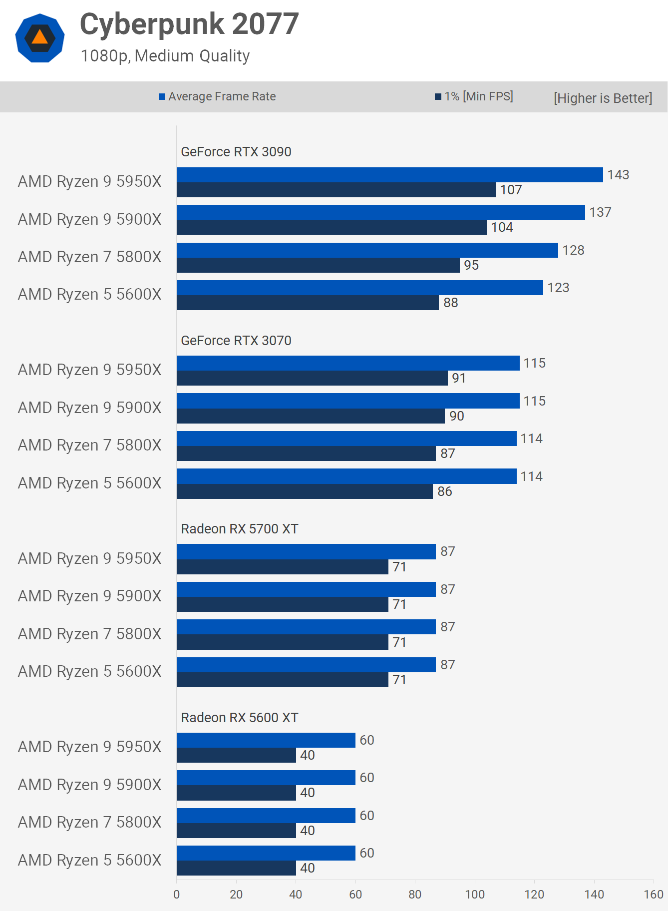 The 1080p medium results are quite interesting as we appear to be running into a single thread type limitation with the Zen 3 architecture. This is made evident by the performance from the 5700 XT right up to the mighty RTX 3090 which is all similar, suggesting a strong CPU bottleneck here and it's clearly not core related.