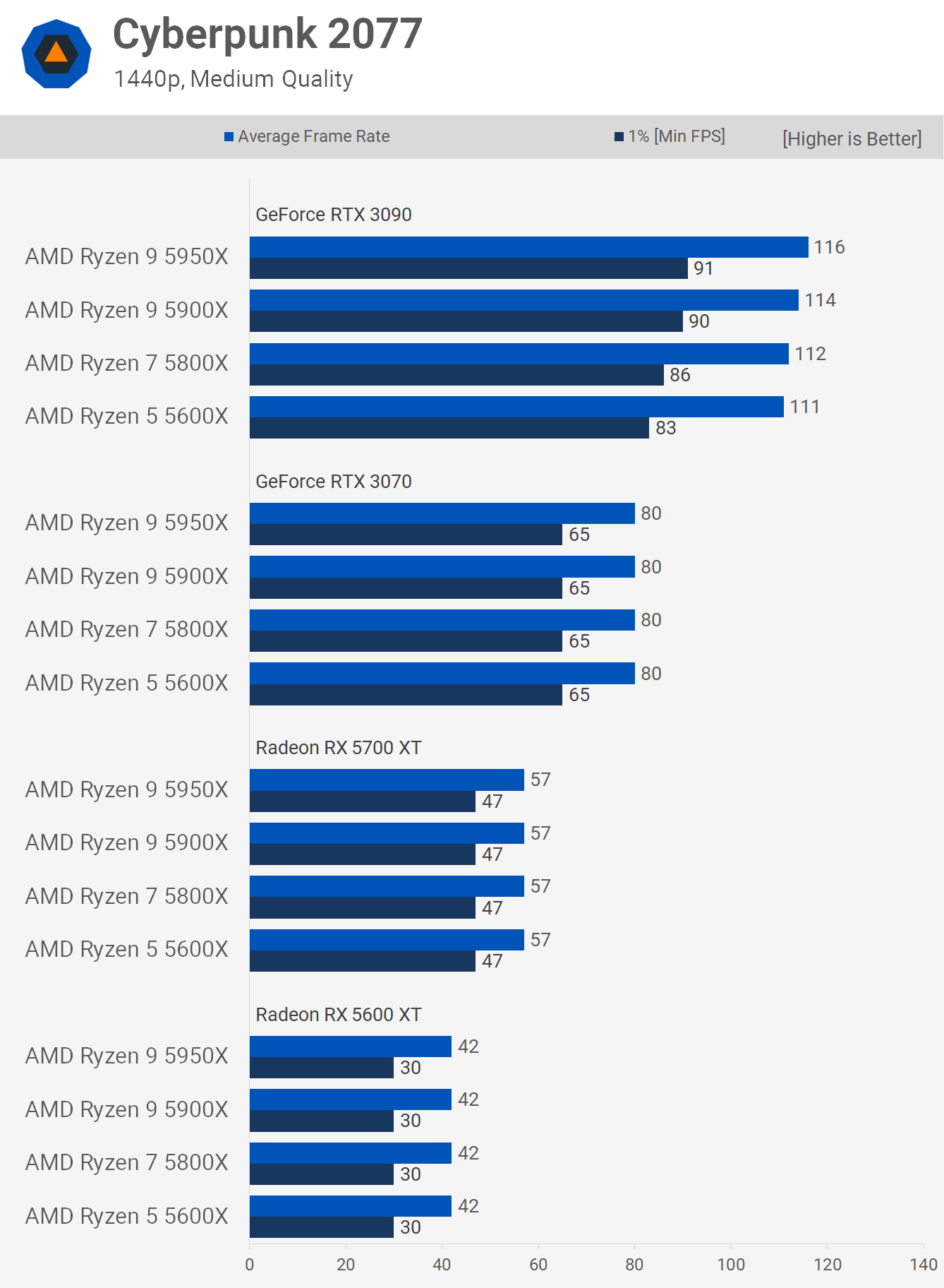 Here we're seeing up to a 10% improvement in performance when going from the 5600X up to the 5950X, and this is seen when comparing the 1% low data using the RTX 3090. But once we drop down to the RTX 3070 the game is 100% GPU limited with no chance for the CPU to make a performance difference. Basically if you have an RTX 3070 or slower and play games like Cyberpunk 2077 at 1440p using just medium quality settings, it really doesn't matter which Zen 3 CPU you have, performance will be identical.