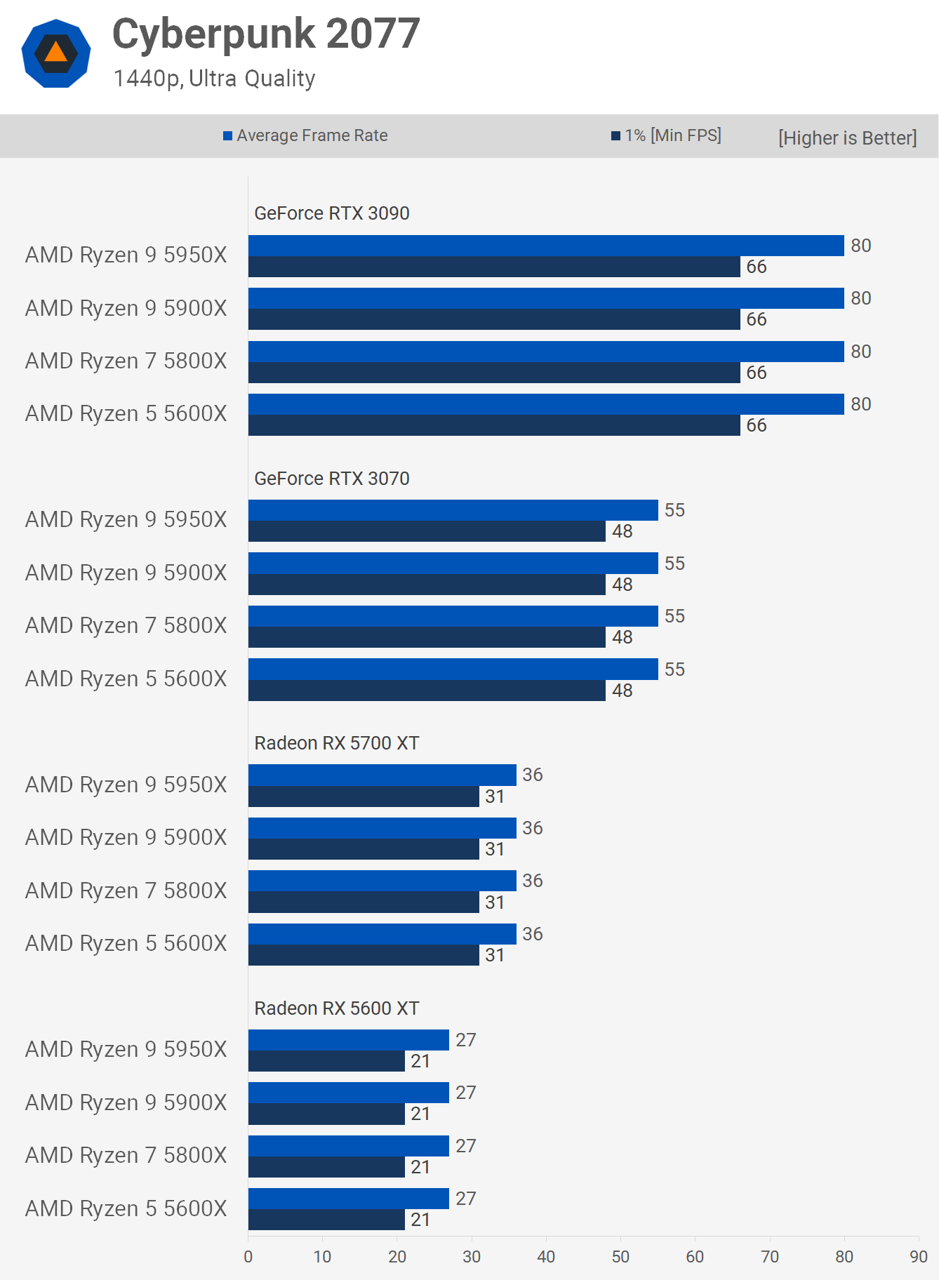 That said, this is only seen with the RTX 3090, dropping down to the RTX 3070 sees the game become largely GPU limited, there is still some variation in the 1% low performance, but we're talking at most a 6% discrepancy. Once we drop down to the 5700 XT all CPUs are seen delivering the exact same level of performance.