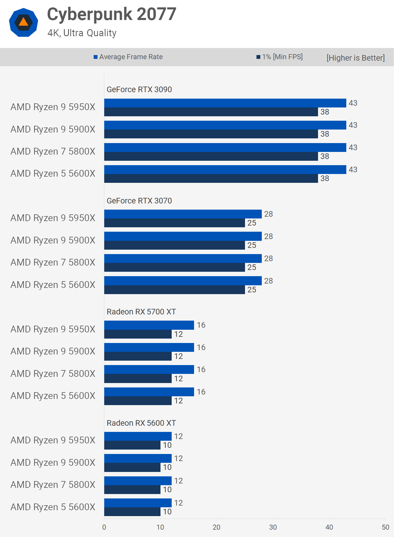 As we've found previously the 4K resolution is just too extreme even for the RTX 3090 and as a result here we're heavily GPU bound, leaving no room for the CPU to influence performance by even a few frames.