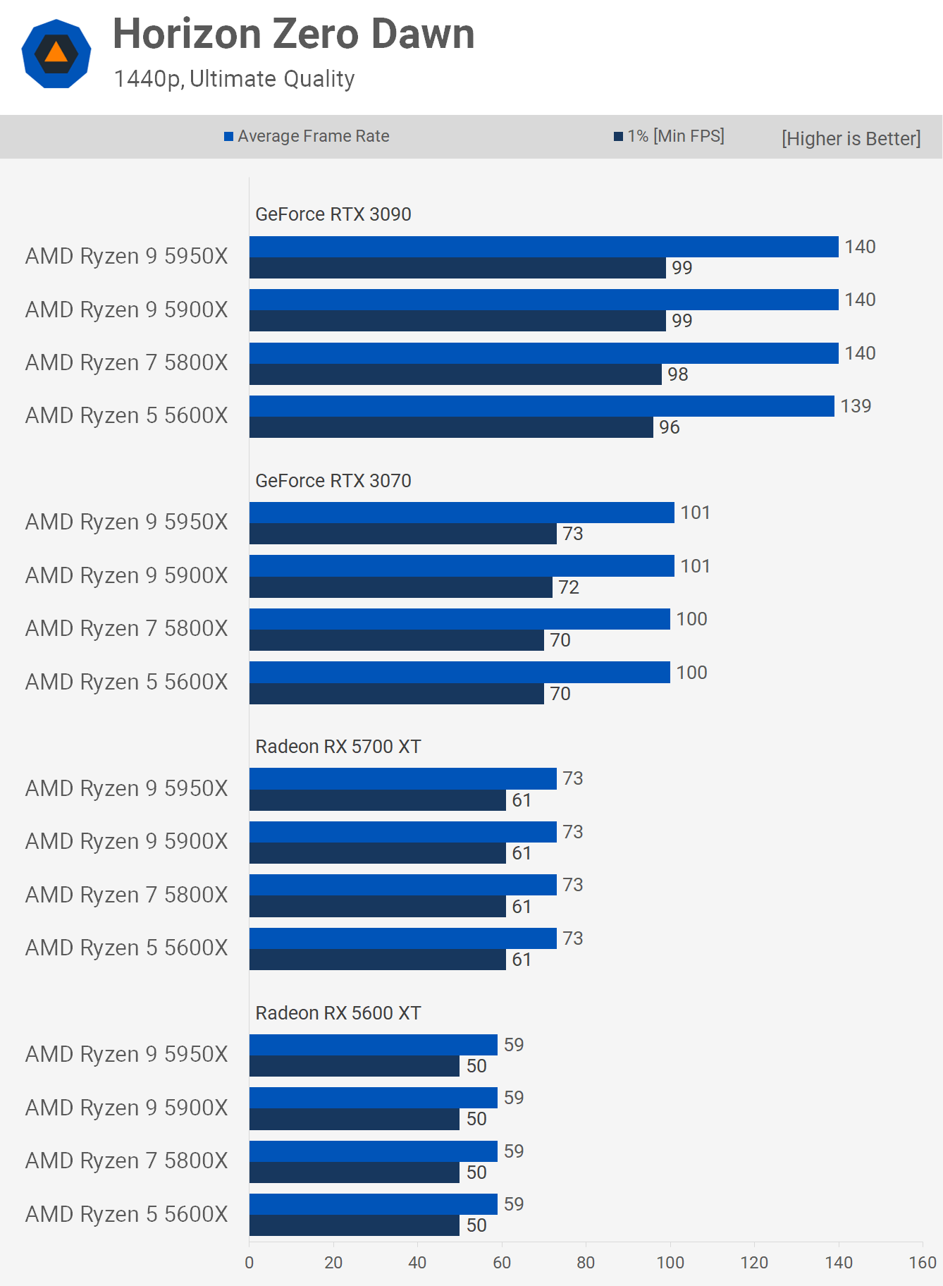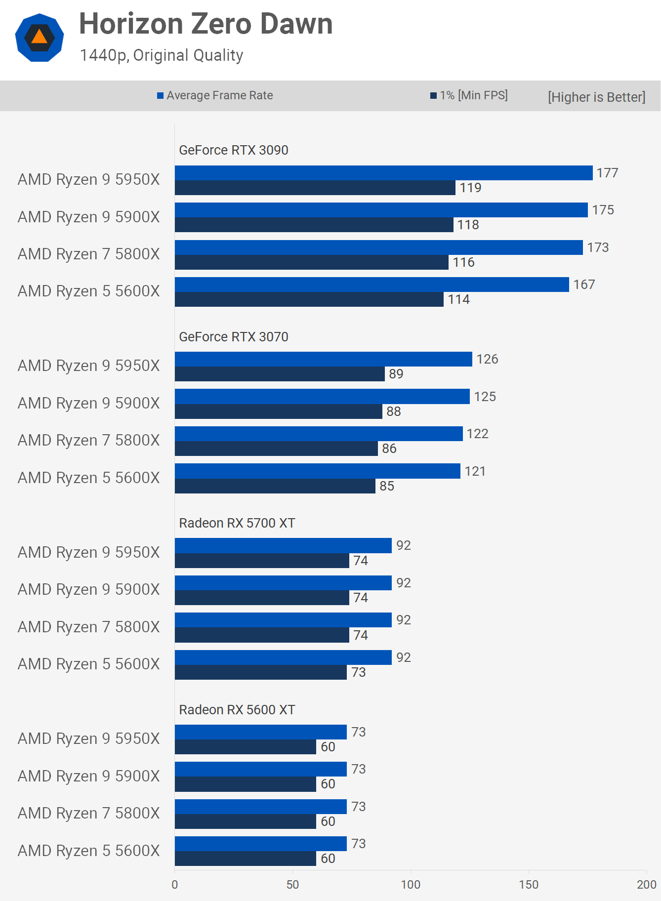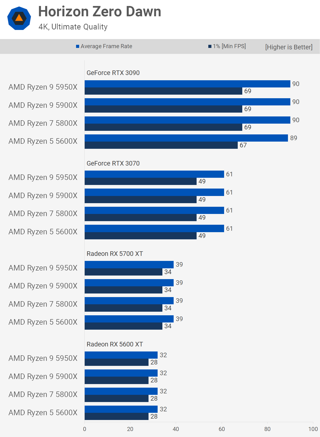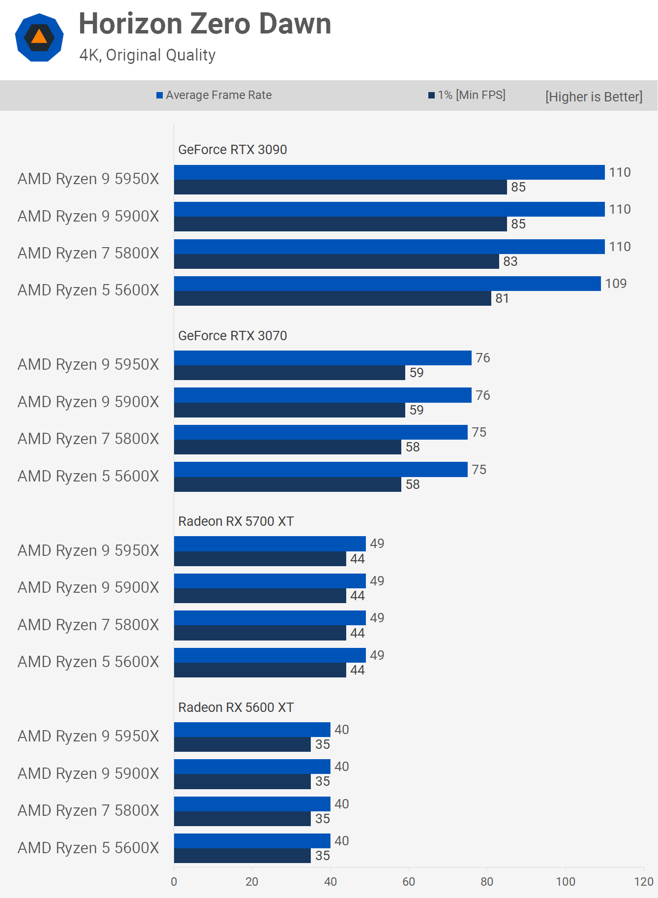 Horizon Zero Dawn isn't a very CPU demanding game and I've found in the past you'll be GPU limited even at 1080p with an RTX 3090 using any modern Intel or AMD CPU. That being the case you might think it's not a suitable game for this kind of test and while a case for that can certainly be made, I feel it's important to include new triple A titles that like most games, aren't limited by CPU performance, at least within reason.