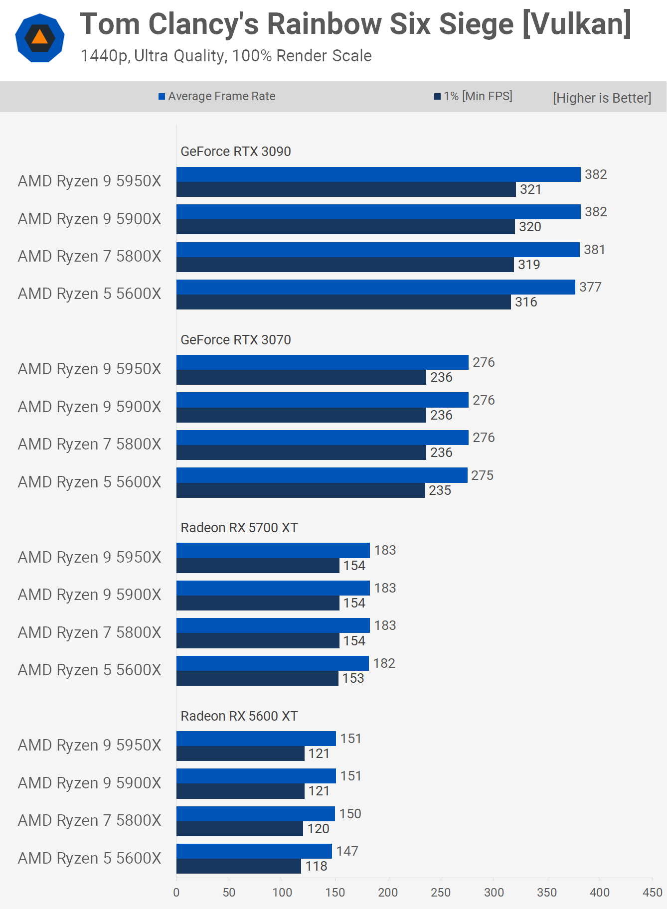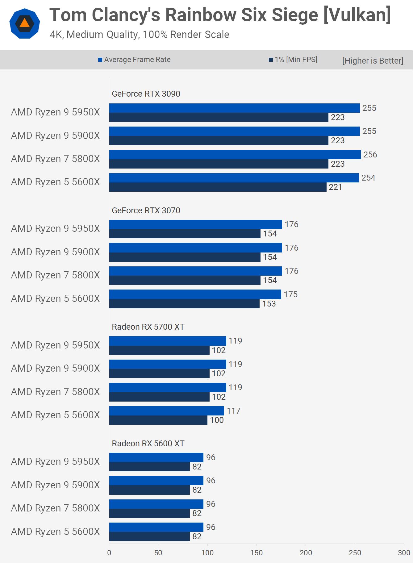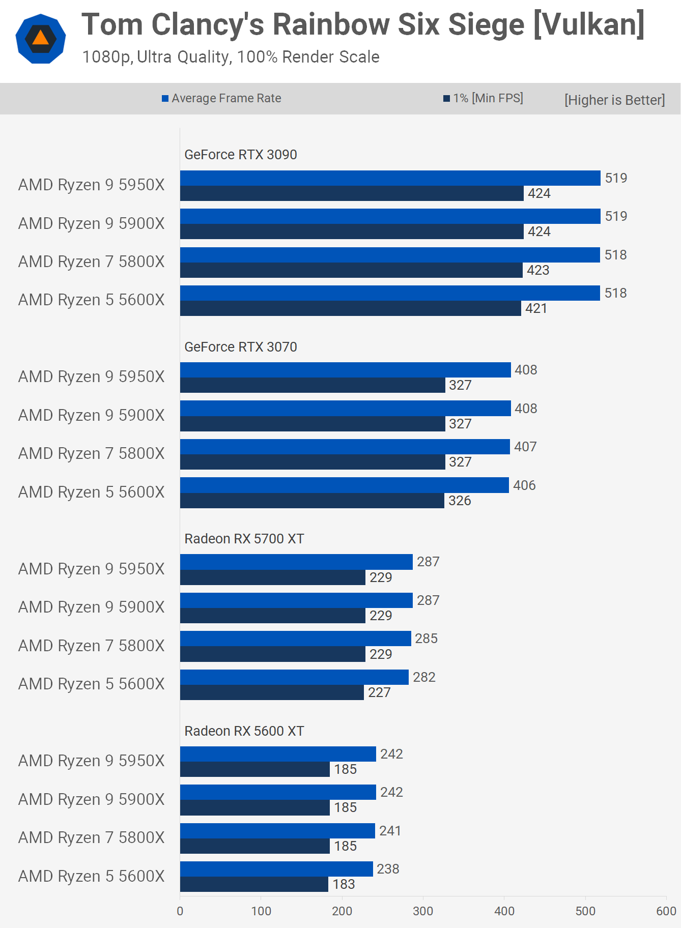 Nothing earth shattering came in after all that testing, but it does help put to rest a few questions we've seen going around regarding lower quality settings, competitive titles, core counts, and so on. Basically, it doesn't matter how fast your graphics card is, you can go right up to a GeForce RTX 3090 and you'll sacrifice nothing by using a Ryzen 5 5600X. This applies whether you're playing esports titles using competitive quality settings, like what we saw in Rainbow Six Siege, or the latest and greatest AAA titles like Cyberpunk 2077.