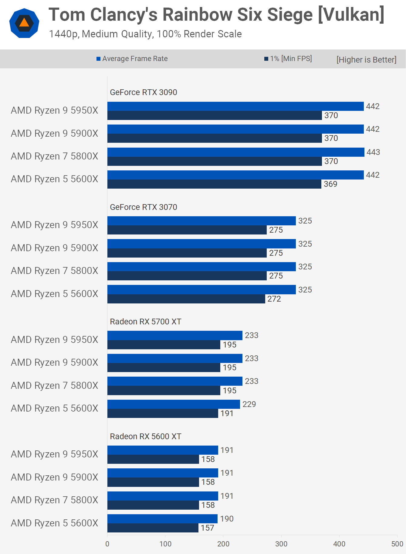 The same is true even with the medium quality preset, all four CPUs pushed the RTX 3090 to just over 440 fps on average, so again it really doesn't matter which of these CPUs you use for gaming with a title like Rainbow Six Siege, frame rate performance is going to be basically the same, if not the same.
