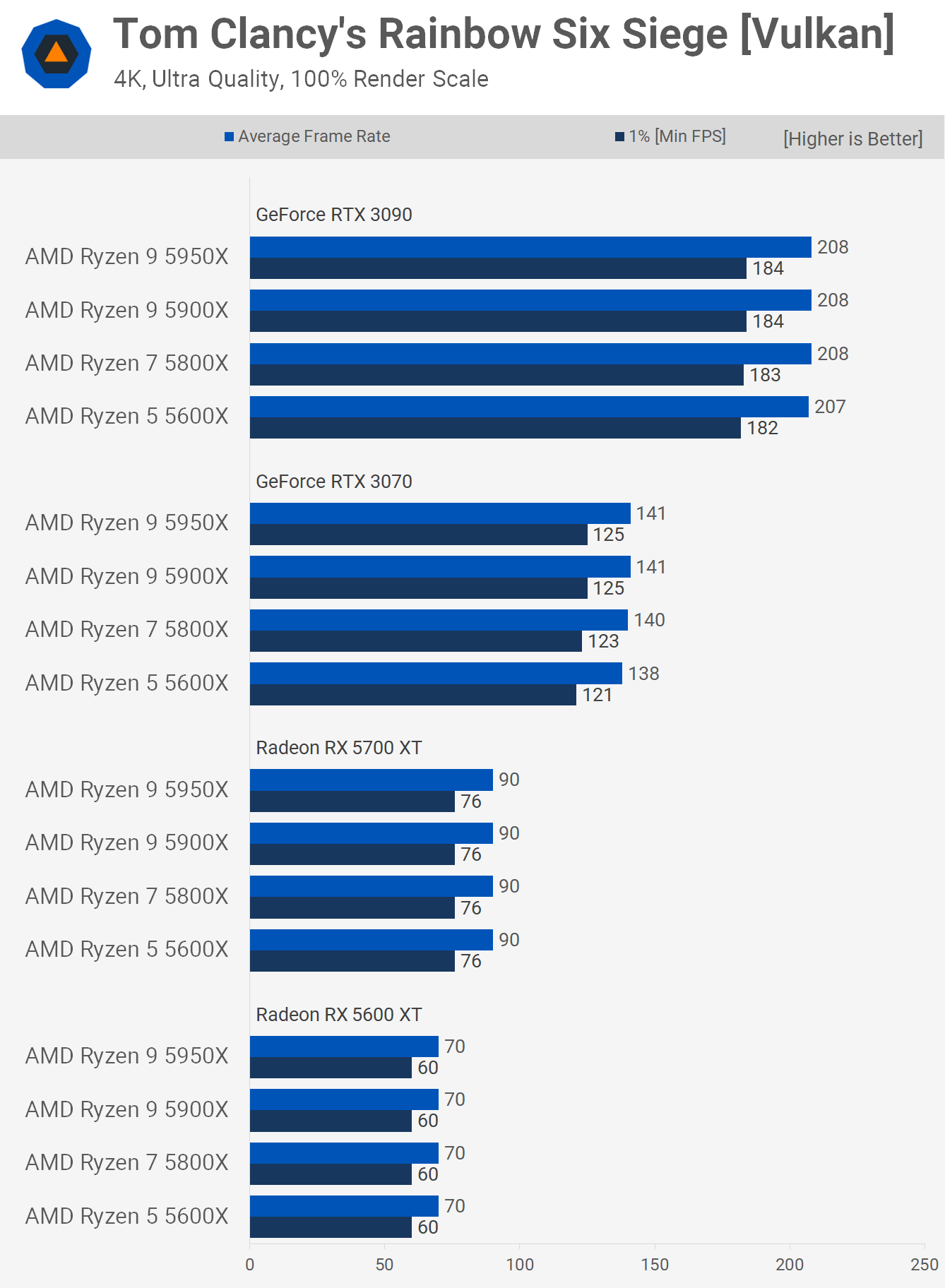 At 1080p using the ultra quality preset we found that on average there is no performance difference to be seen in modern games when using the RTX 3070, 5700 XT and 5600 XT. Again, as seen in the day one review, the 5950X only offers a ~4% performance boost over the 5600X, and with both delivering smooth performance in all games, there's little reason to go beyond the 6-core/12-thread processor.