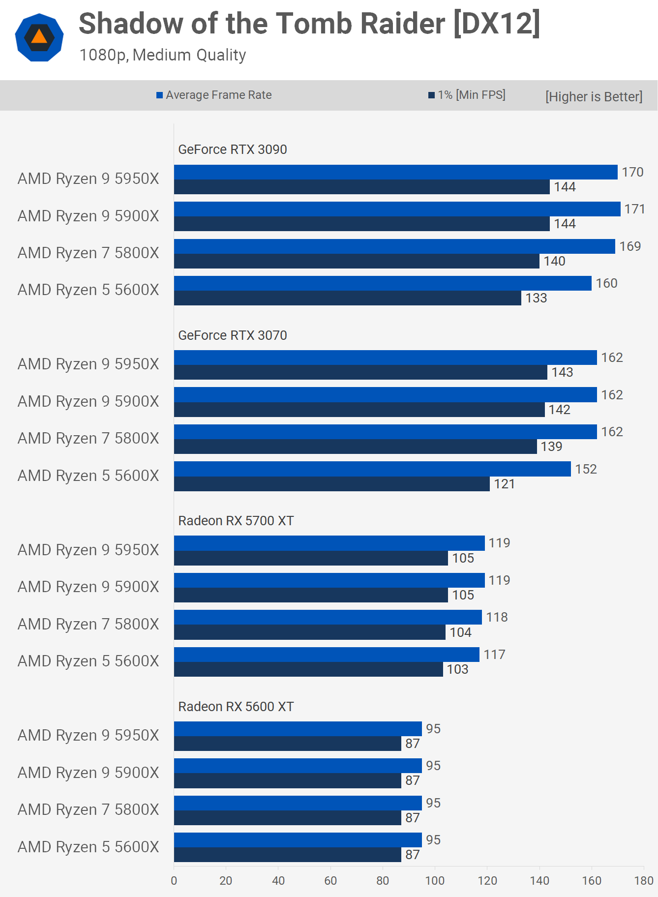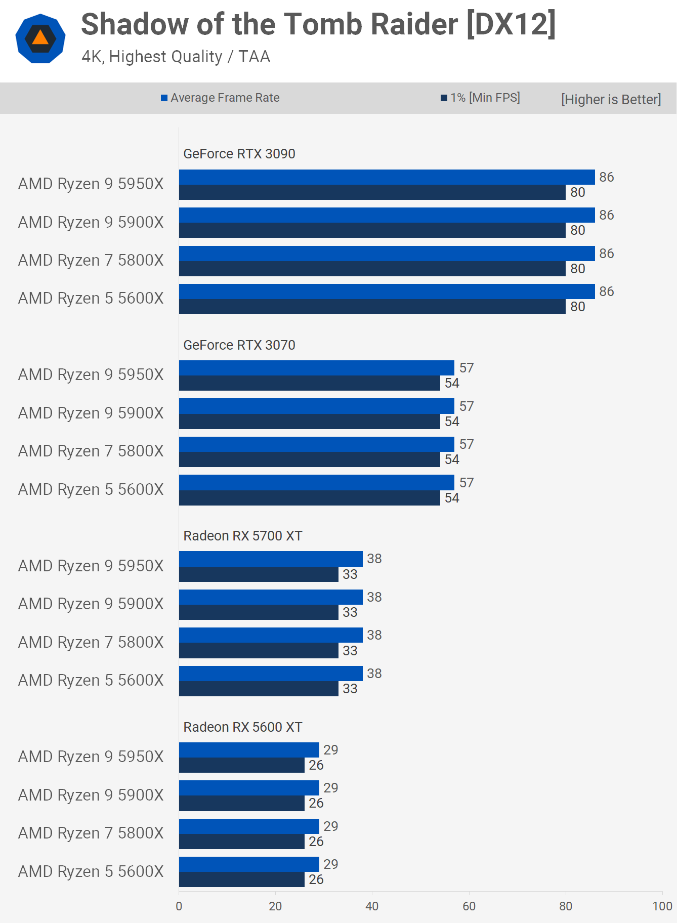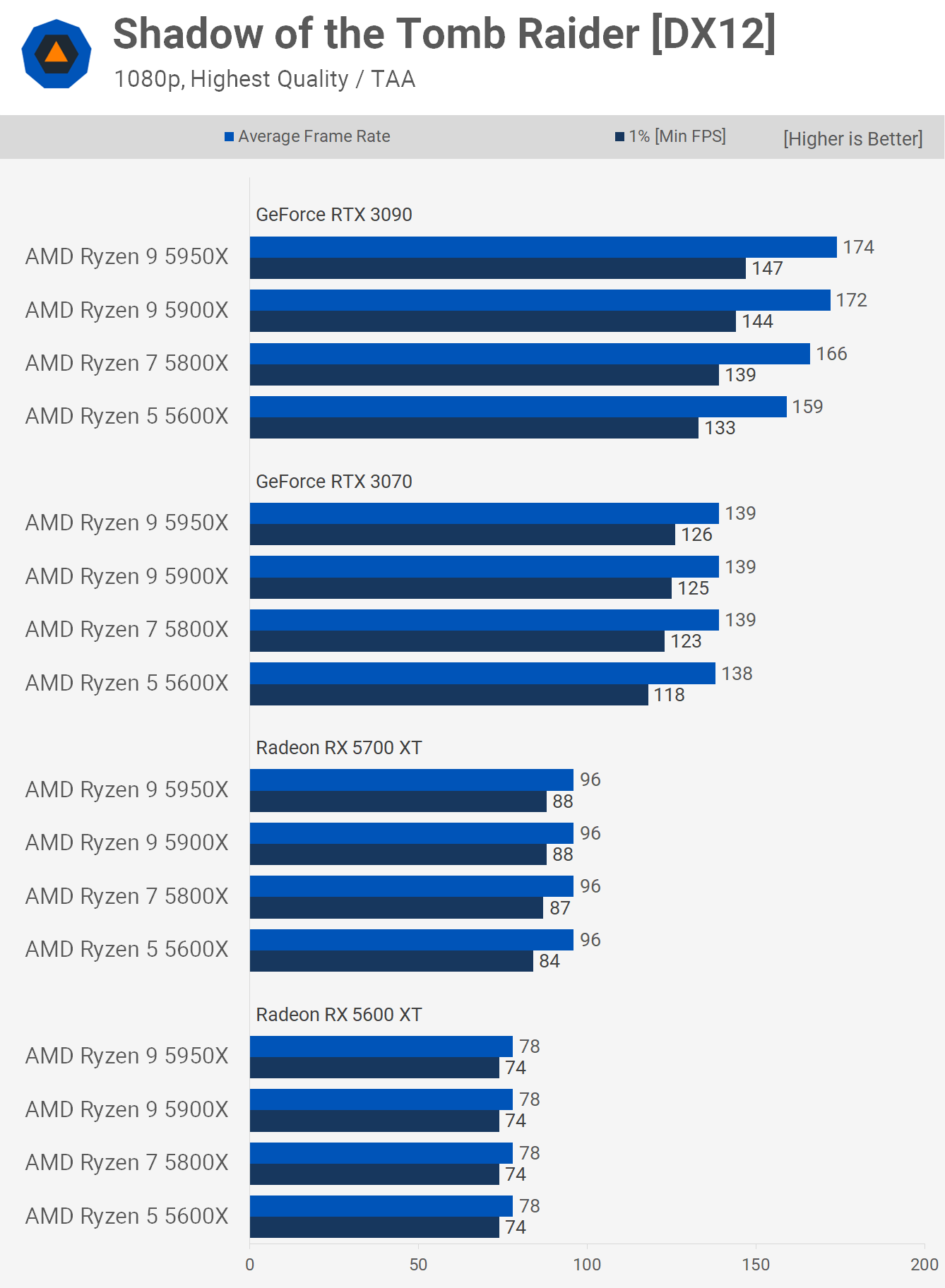 SoTR is a very CPU demanding title, much more so than most games. Tomb Raider heavily utilizes the CPU and not just one or two cores, but can spread the load quite evenly across many cores. The game plays just fine with the 5600X, but in some more extreme instances it does leave performance on the table, like what we're seeing here at 1080p with the RTX 3090.