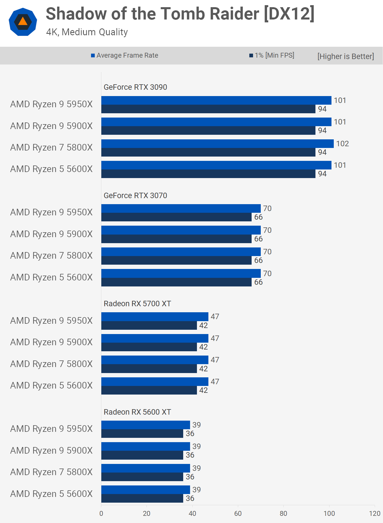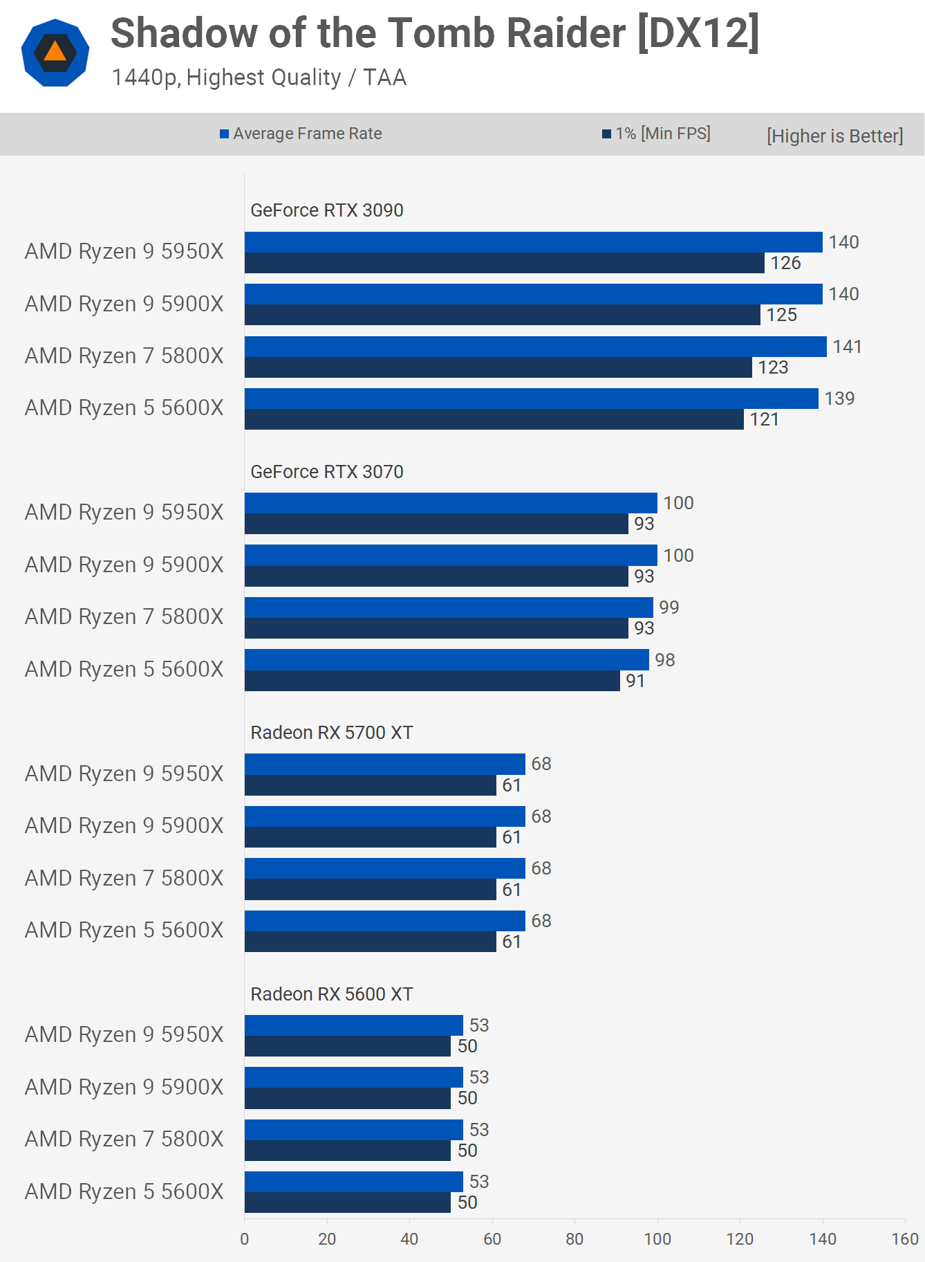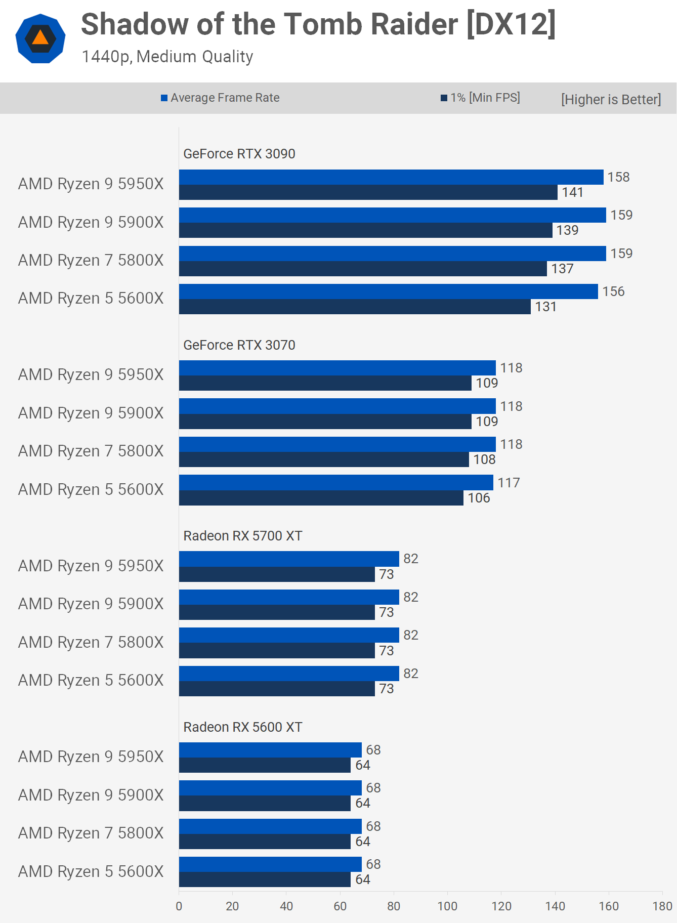 SoTR is a very CPU demanding title, much more so than most games. Tomb Raider heavily utilizes the CPU and not just one or two cores, but can spread the load quite evenly across many cores. The game plays just fine with the 5600X, but in some more extreme instances it does leave performance on the table, like what we're seeing here at 1080p with the RTX 3090.