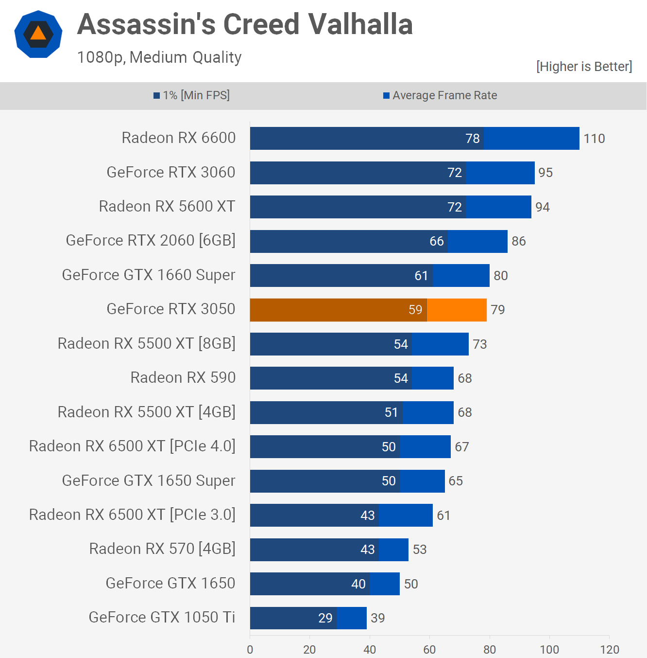 Starting with Assassin's Creed Valhalla, using the medium quality preset at 1080p, we find that the RTX 3050 is good for 79 fps on average, so here it's basically a GTX 1660 Super. That made it 18% faster than the 6500 XT using PCIe 4.0, and 30% faster when compared to the PCIe 3.0 configuration. It was also only 8% slower than the RTX 2060, a decent result overall.