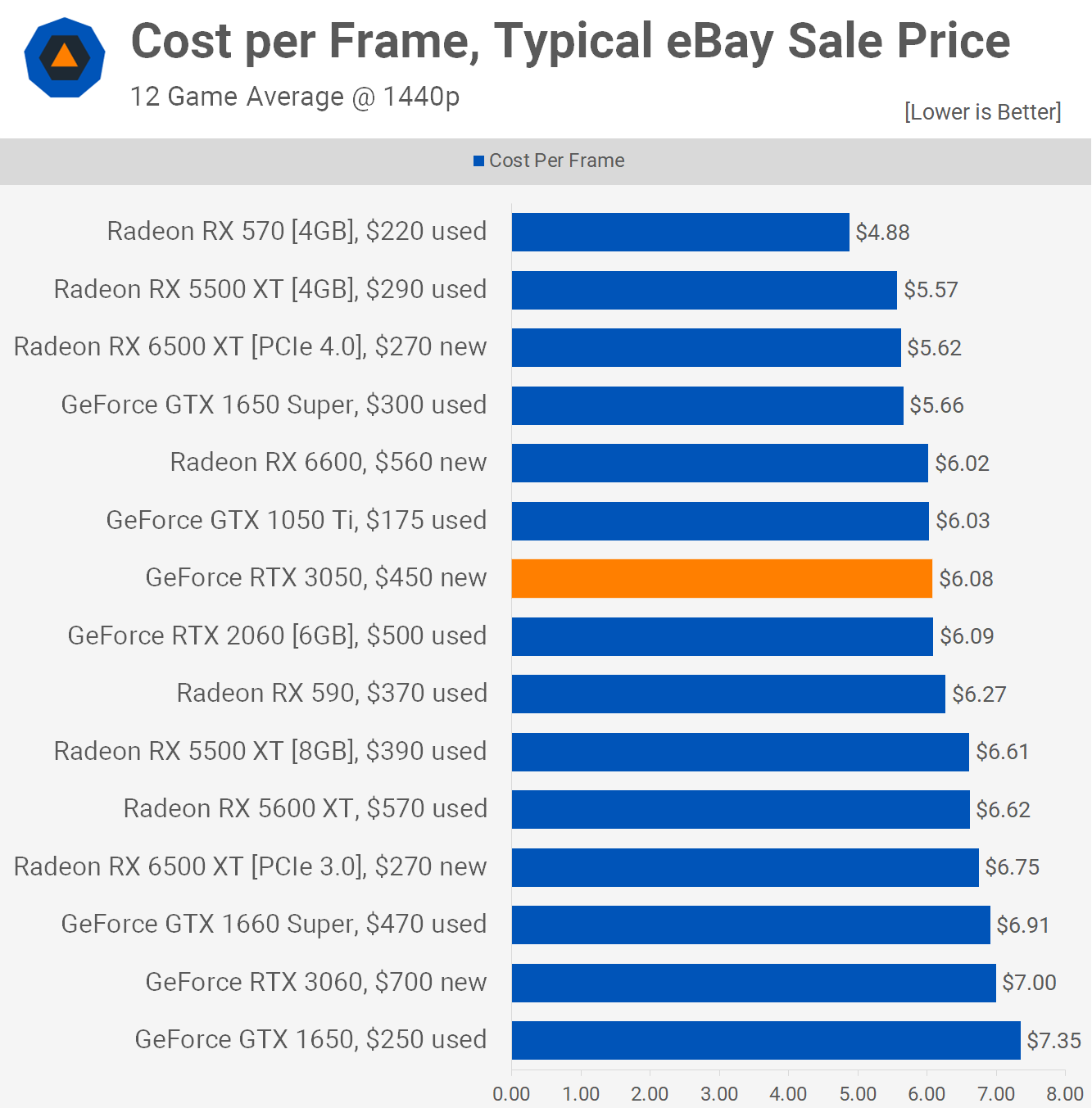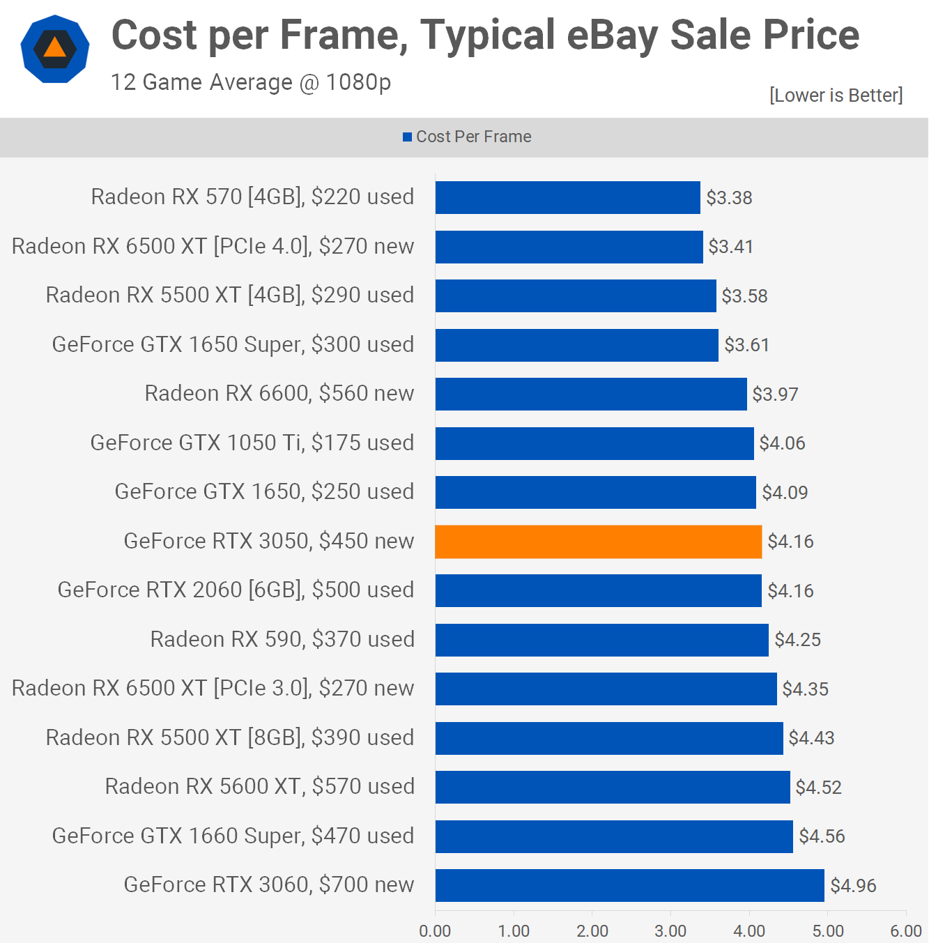 For the used GPUs, we're taking the average sale price seen over at eBay over the past 4 weeks, and for the new GPUs the pricing is based on what we could find in stock at places like Newegg. This places the 6500 XT at $270, and we're expecting the RTX 3050 to cost at least $450, though please note that's an educated guess since the cards have yet to go on sale.