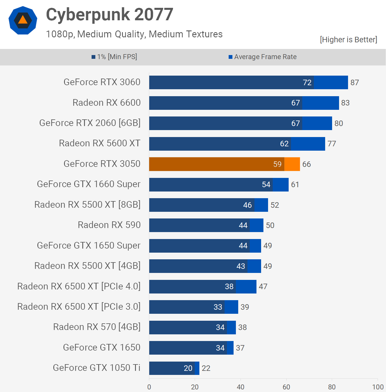 Last up we have Cyberpunk 2077, and here the RTX 3050 managed to break the 60 fps barrier with the medium quality preset, averaging 66 fps which all things considered is quite a good result. Unfortunately, it was 18% slower than the RTX 2060, but it was also 40% faster than the 6500 XT, or 69% faster when using PCIe 3.0.