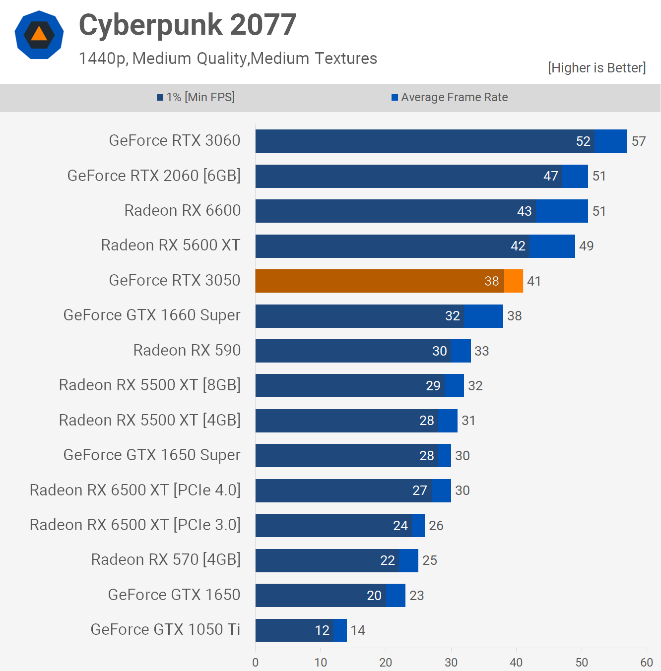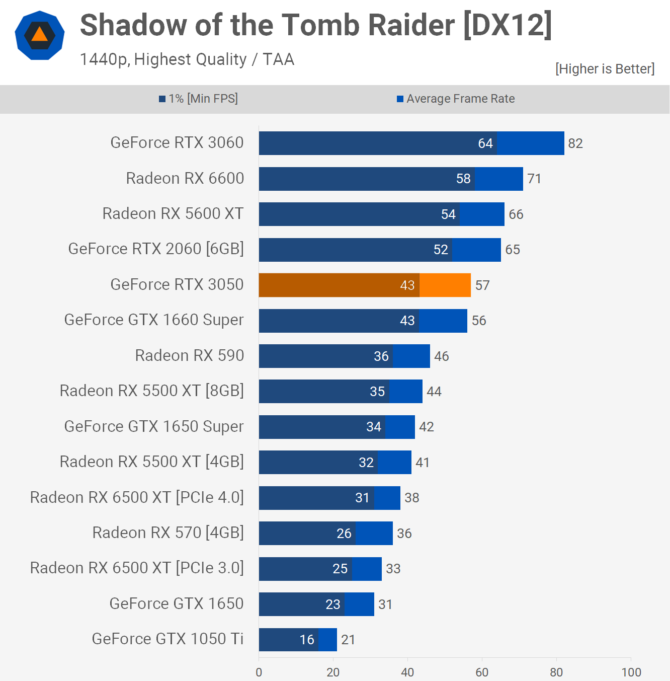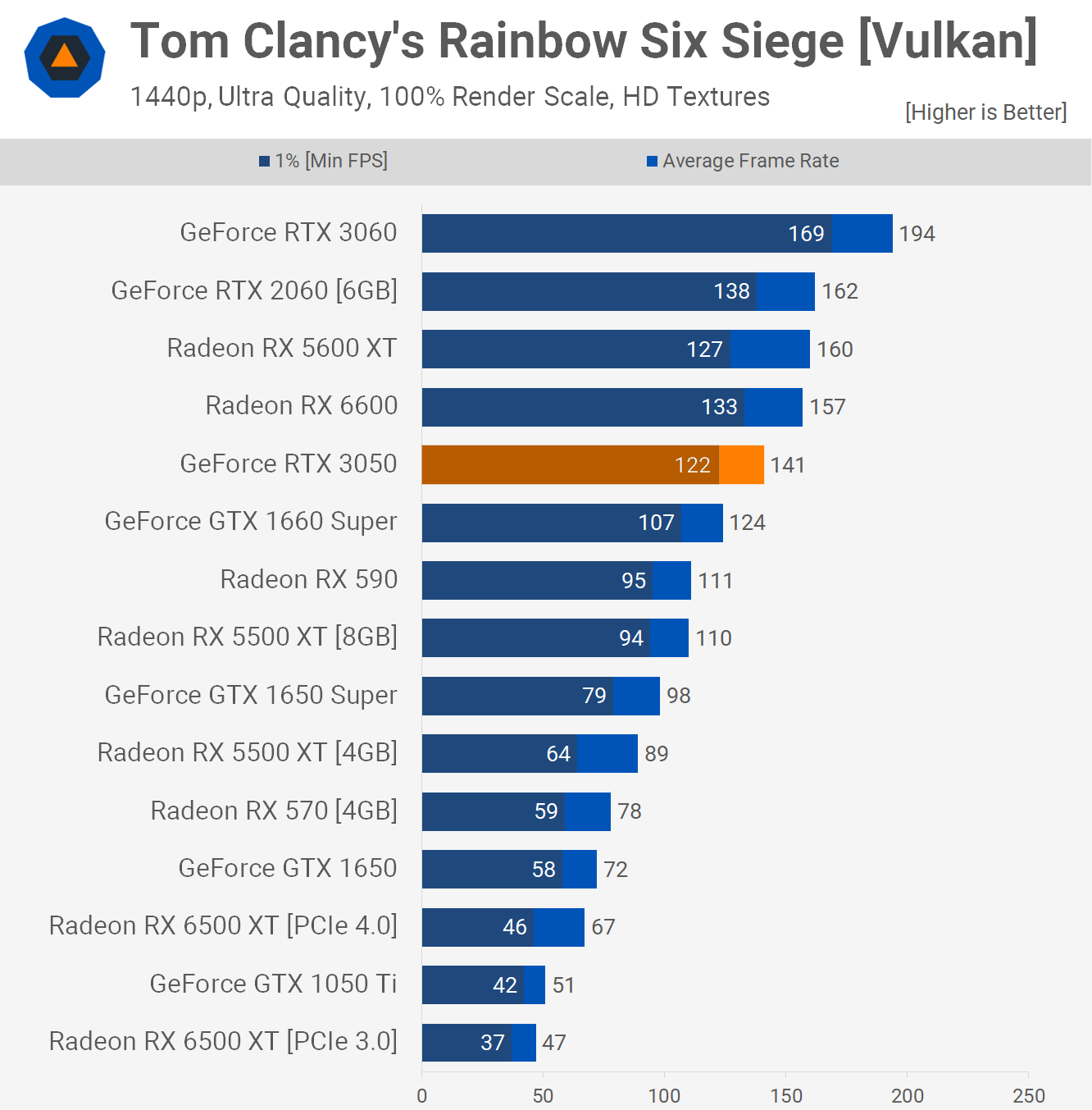 The RTX 3050 does race away with it at 1440p, averaging over 60 fps to make it 28% faster than the 6500 XT or 36% faster than the PCIe 3.0 configuration. It was also 10% faster than the GTX 1660 Super, but 14-15% slower than the RTX 2060 and 5600 XT.