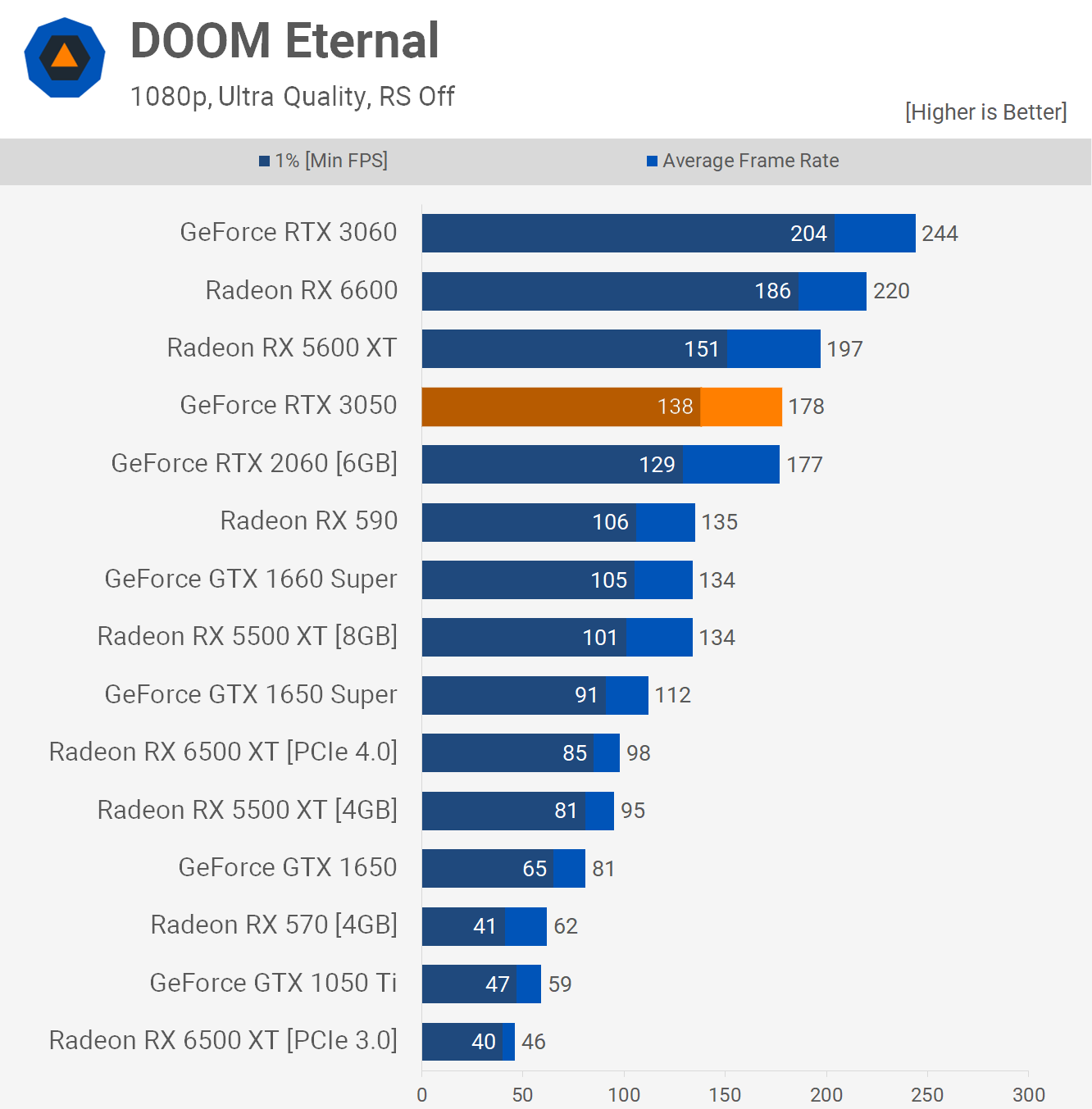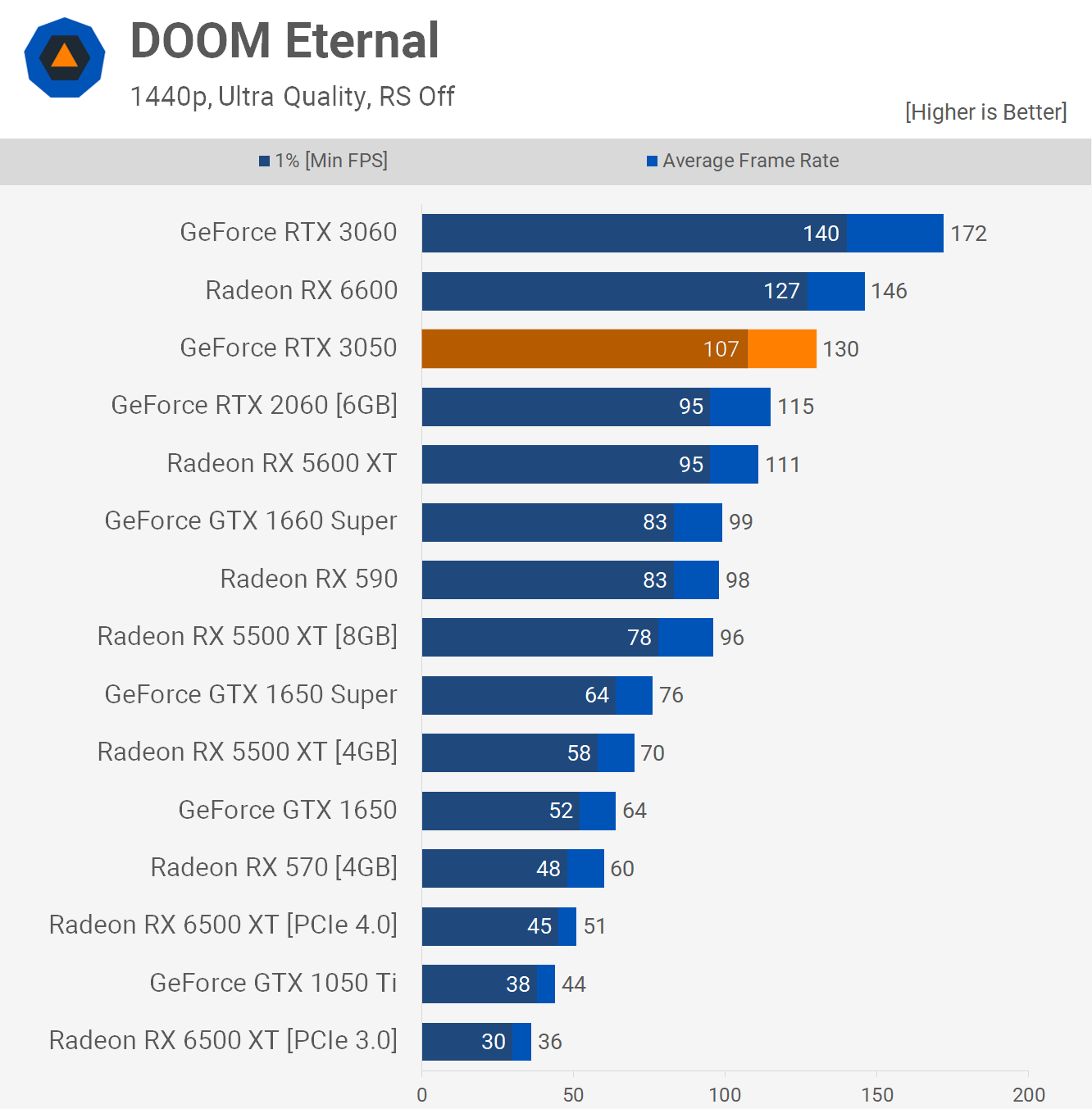 In Doom Eternal, the RTX 3050 does extremely well matching the RTX 2060 with 178 fps on average. That meant it was 82% faster than the 6500 XT and 287% faster than the PCIe 3.0 configuration. That's all we need to say about that.