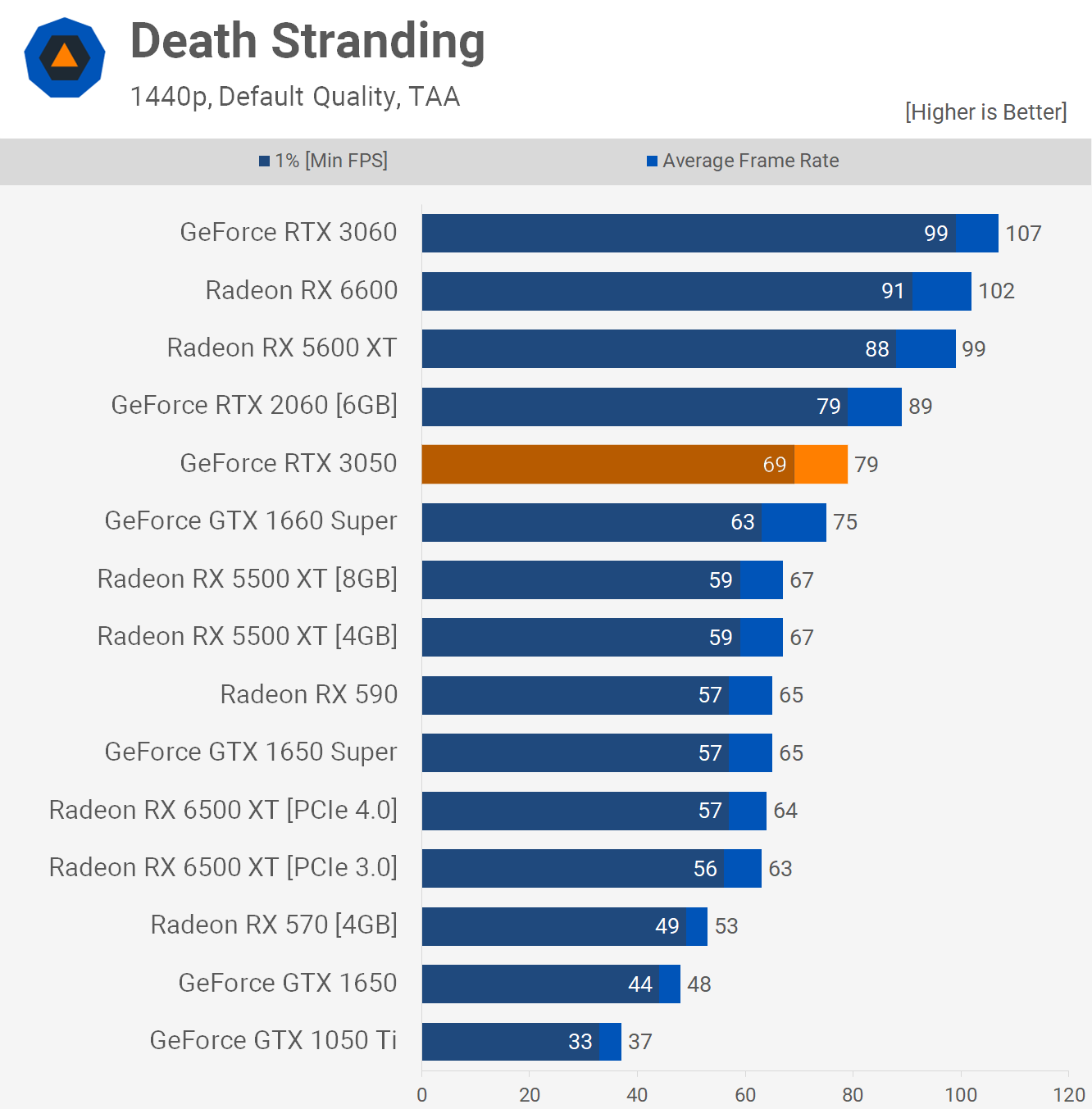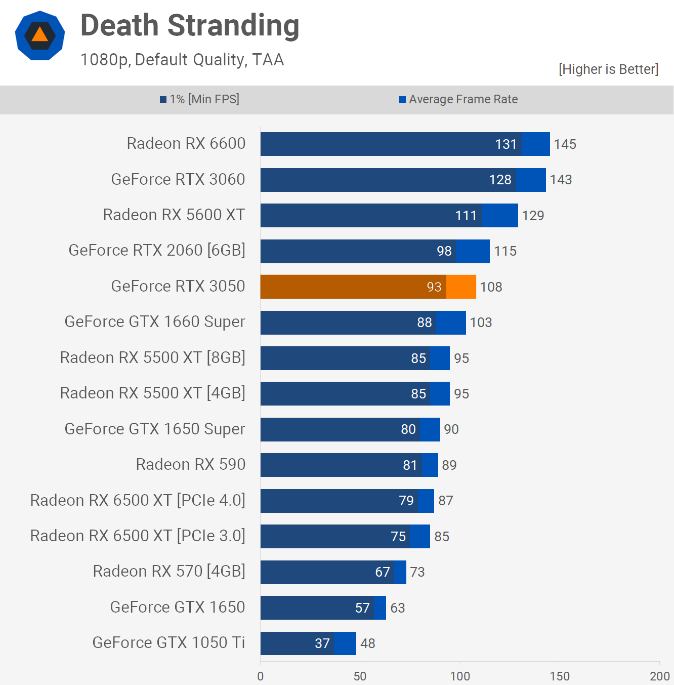 Next up we have Death Stranding, and this is another game that isn't terribly demanding, despite looking quite nice. The GTX 3050 was good for 108 fps using the default quality preset at 1080p and that placed it directly between the 1660 Super and GTX 2060, a great result.