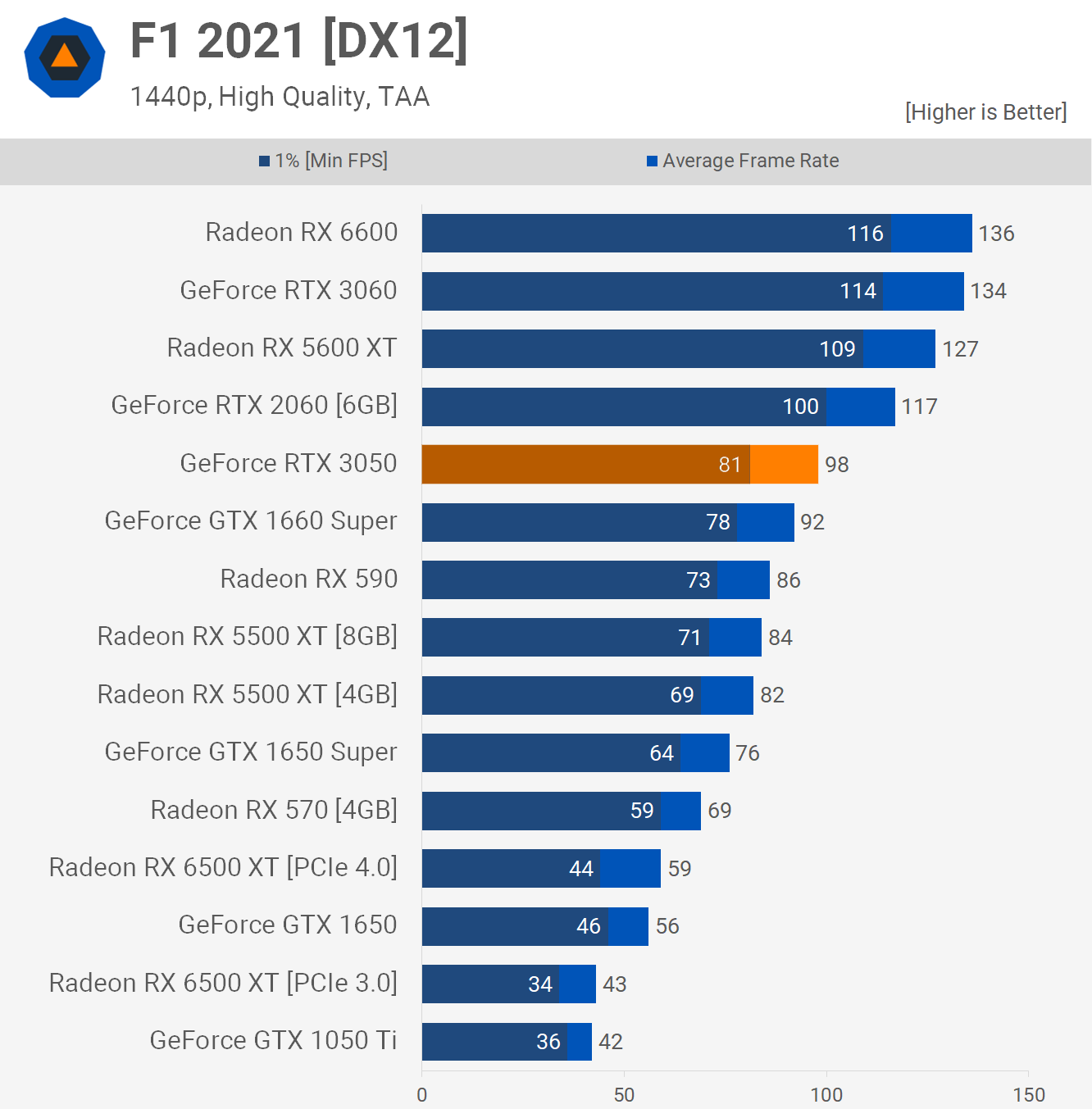 The RTX 3050 had no such issues though, pumping out a super impressive 130 fps while keeping 1% lows above 100 fps. It was also 13% faster than the RTX 2060 and just 11% slower than the RX 6600. A stellar result there.
