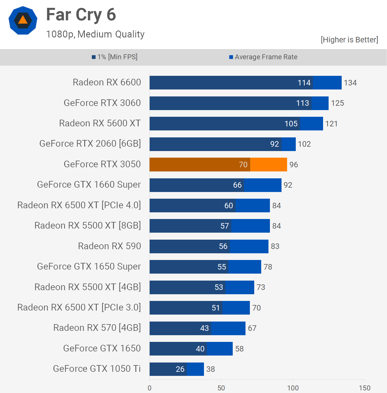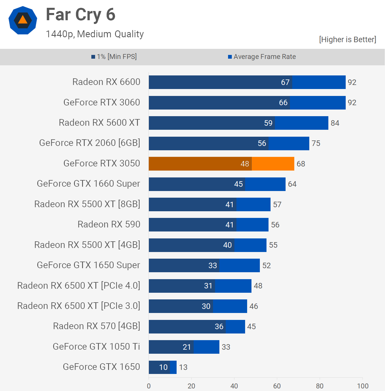 The 6500 XT turns in one of its better figures in Far Cry 6 and as a result the 3050 was just 14% faster, though the issue for the 6500 XT is PCIe 3.0 and when compared to that configuration the 3050 was 37% faster.