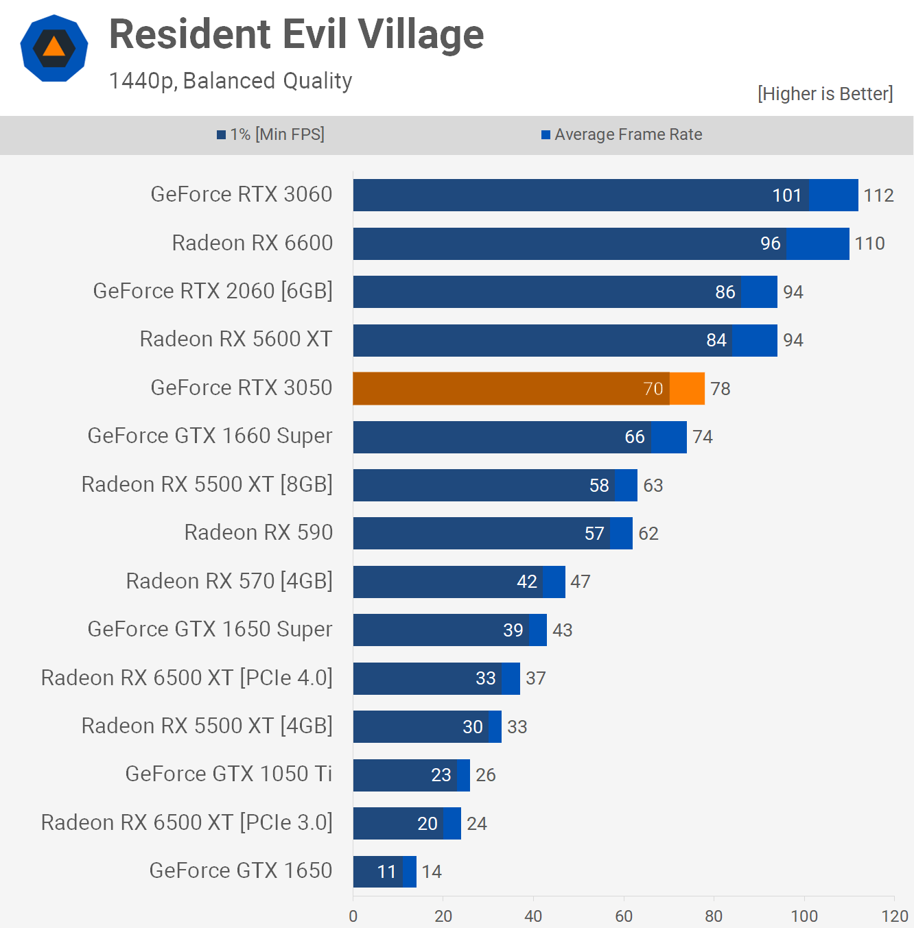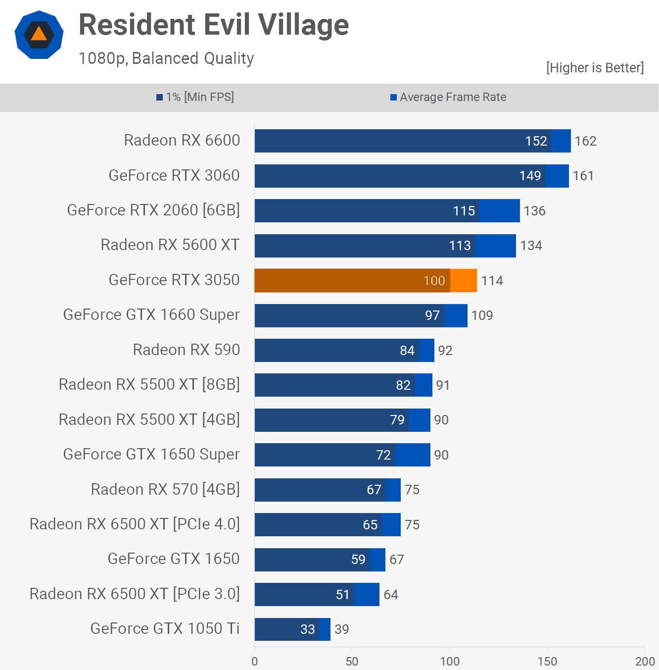 Resident Evil Village isn't a very demanding game, especially with the balanced quality preset, so it's no surprise that at 1080p the RTX 3050 is comfortably pushing over 100 fps, averaging 114 fps. This is GTX 1660 Super-like performance and it meant the new budget GeForce was 52% faster than the 6500 XT, or 78% faster if we compare with the PCIe 3.0 configuration.