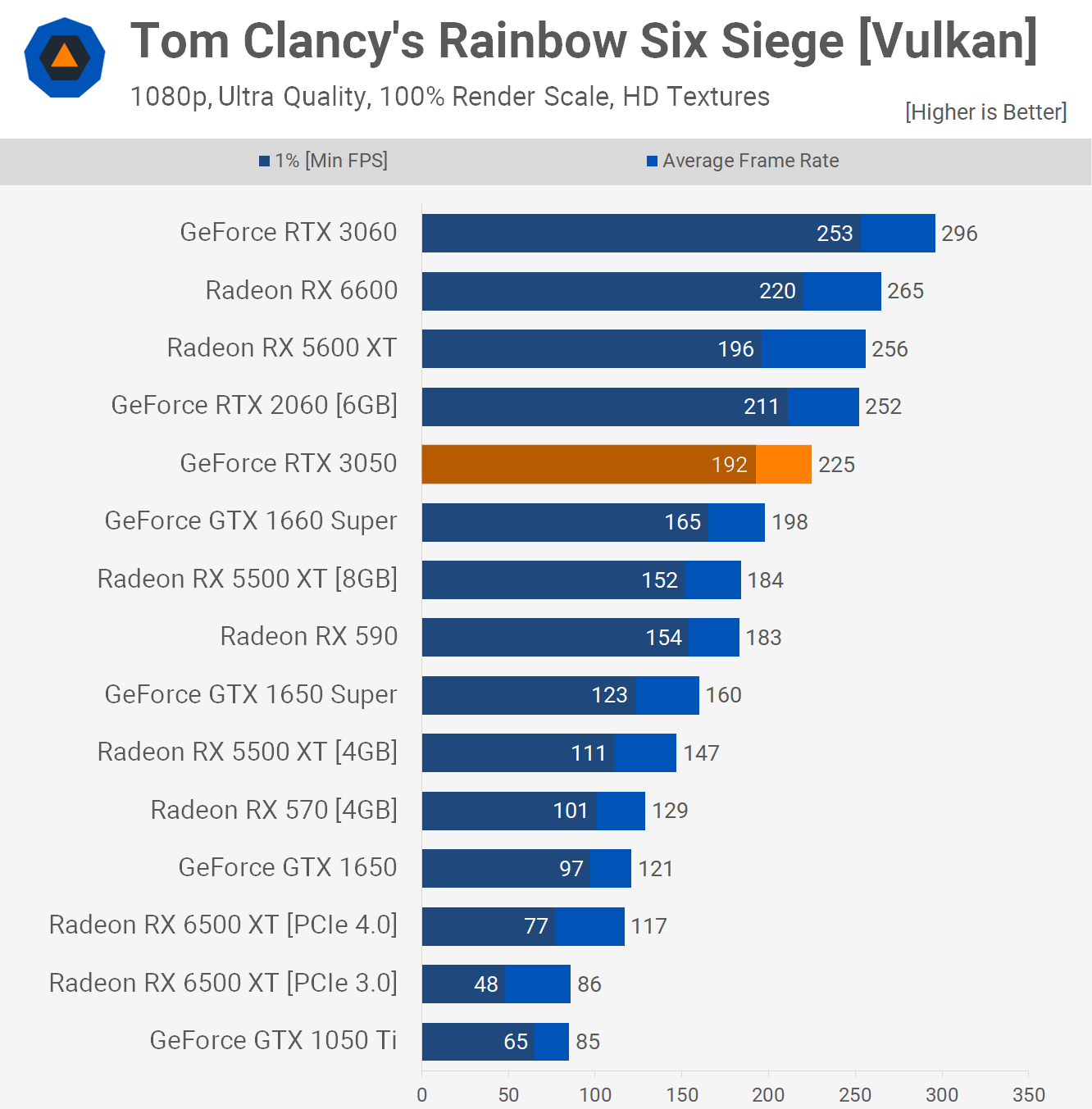 The RTX 3050 had no issue crushing that result with 225 fps on average, making it just 11% slower than the RTX 2060 and 14% faster than the GTX 1660 Super. Unbelievably, it was 92% faster than the 6500 XT, and let's not even bother with the PCIe 3.0 result for that GPU.