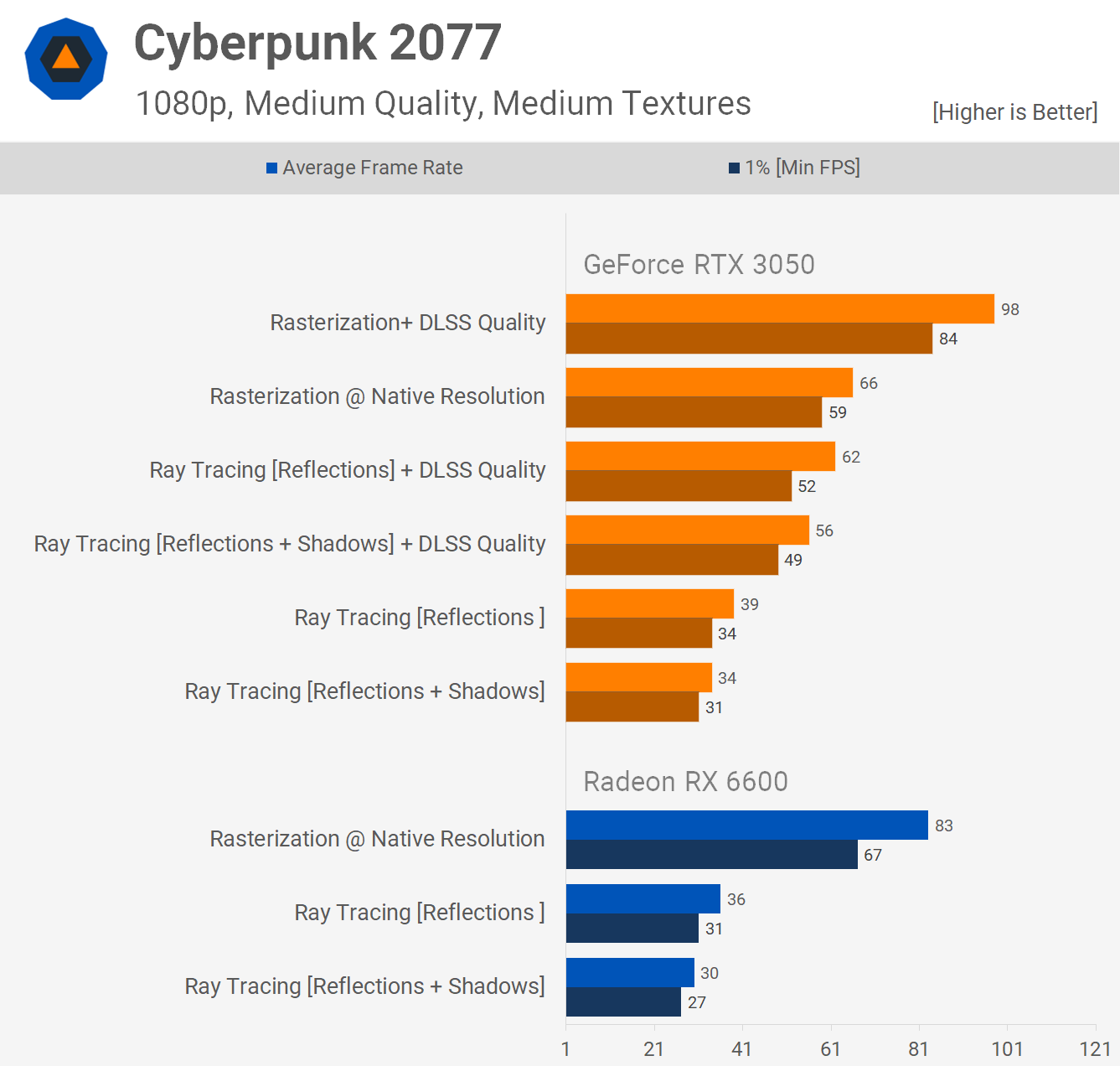 On Cyberpunk 2077 we find that DLSS is most impressive, boosting rasterization performance by an incredible 48%, allowing the RTX 3050 to beat the Radeon RX 6600. Then using ray tracing without DLSS enabled saw the RTX 3060 and RX 6600 delivering comparable performance at 30-40 fps. But of course, enabling DLSS offered a big boost and then the RTX 3050 was good for around 60 fps on average.