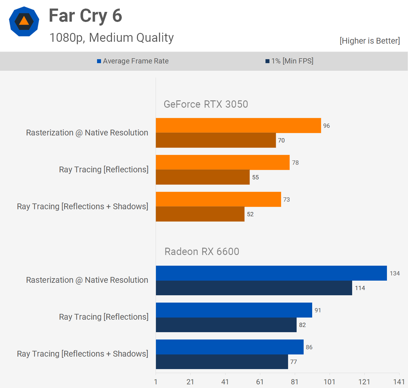 Testing with Far Cry 6, which doesn't support DLSS, sees the RTX 3050 able to comfortably break the 60 fps barrier with ray tracing fully enabled. It was slower than the much more expensive RX 6600, but whereas it was 28% slower without RT enabled, it was just 14% slower with it enabled.