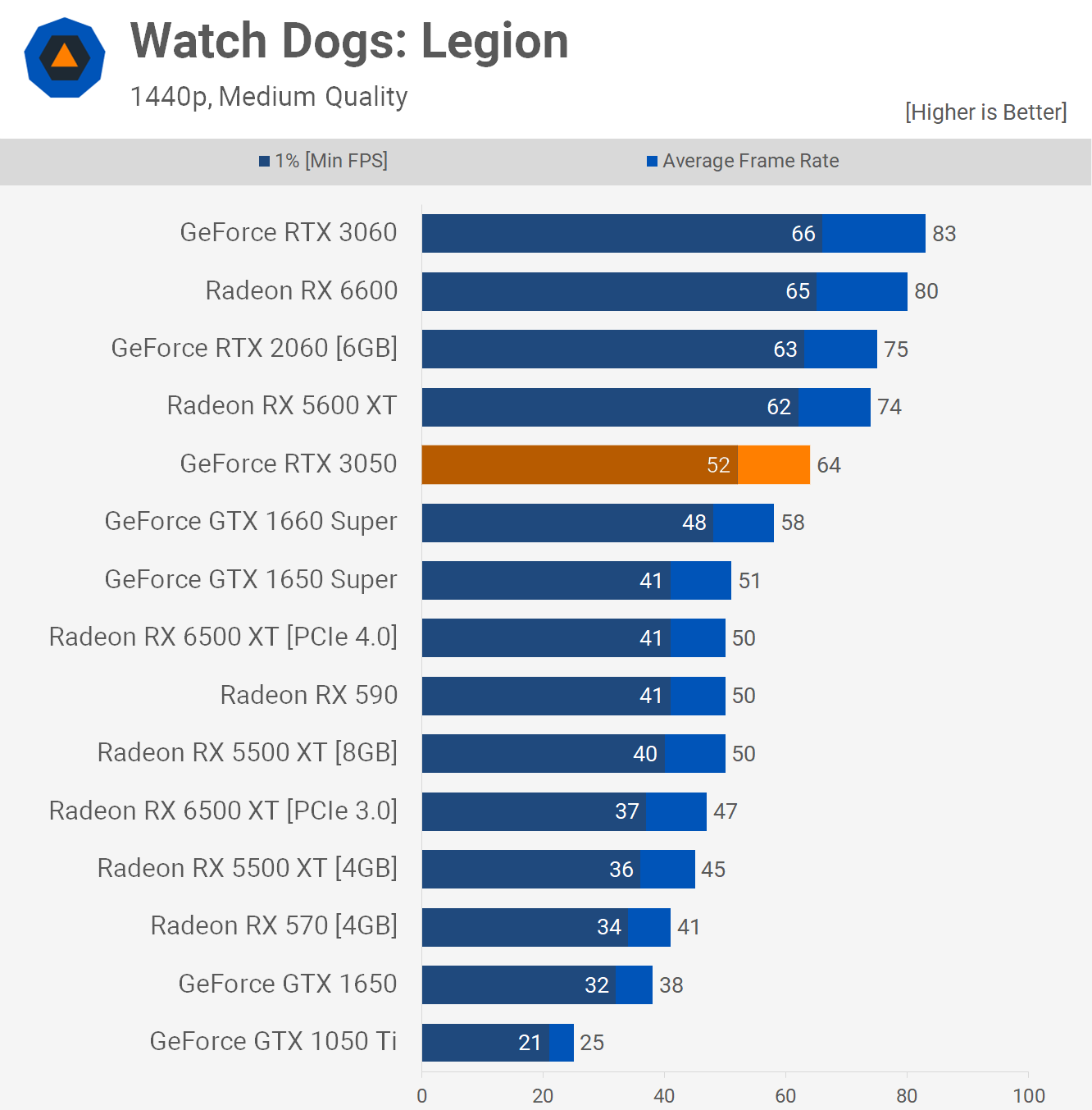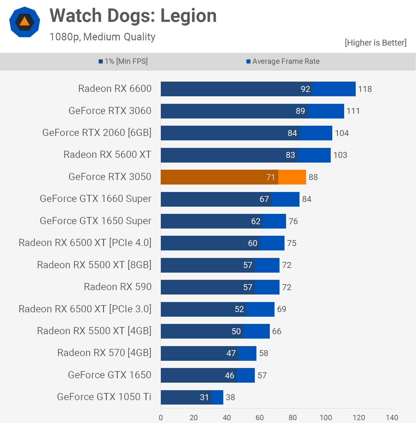 The Watch Dogs: Legion results are quite good for the 6500 XT when using the medium quality preset. Here the RTX 3050 was good for 88 fps and that only made it 17% faster than the 6500 XT, or 28% faster when compared to the PCIe 3.0 configuration, which remains a big win.