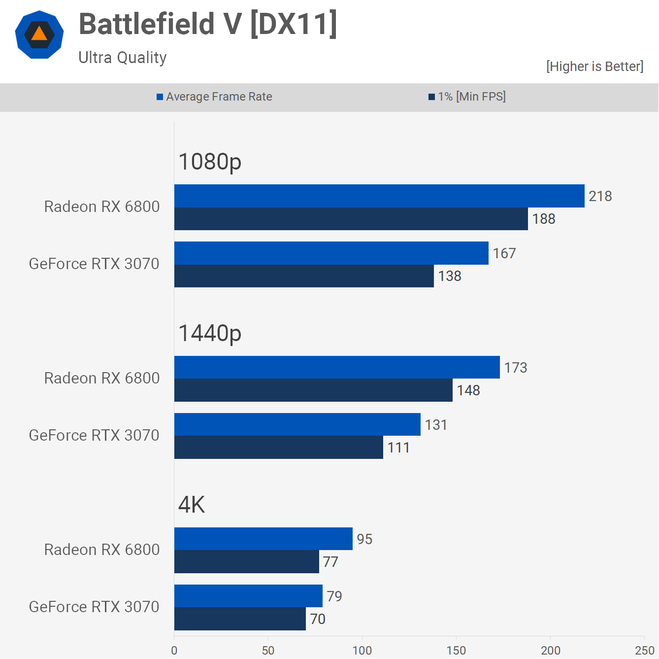 Also we used to test BFV using DX12, but many of you keep reporting frame time issues, claiming DX11 is much smoother, so that's what we've used for this test. For those of you targeting maximum fps at 1080p while maintaining high image quality, the RX 6800 will offer a little over 30% more frames.