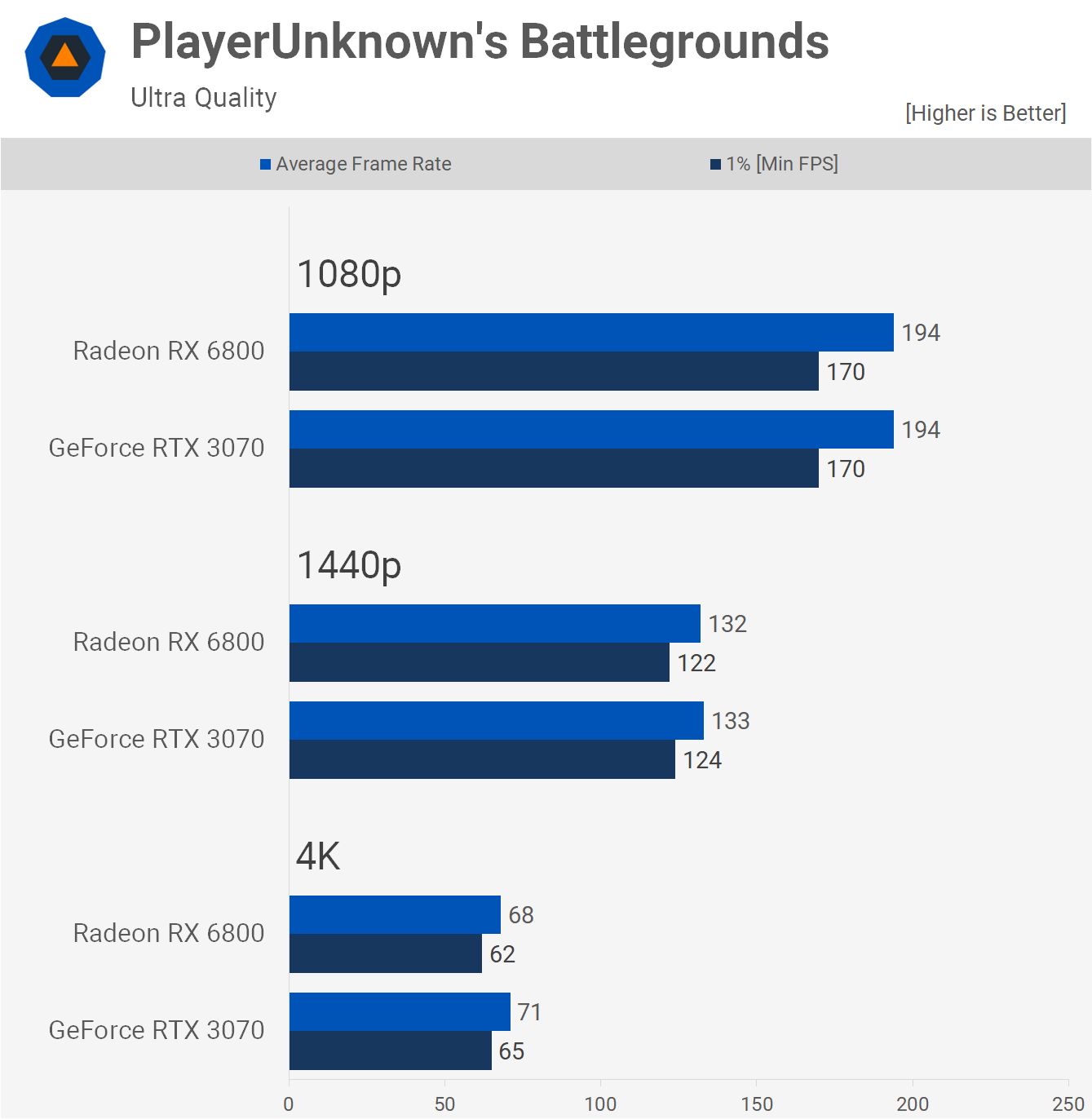 PUBG is another game that like Fortnite didn't do too well for AMD historically. Given the Radeon 6800 is fetching a price premium, seeing it only match the RTX 3070 isn't a great result.