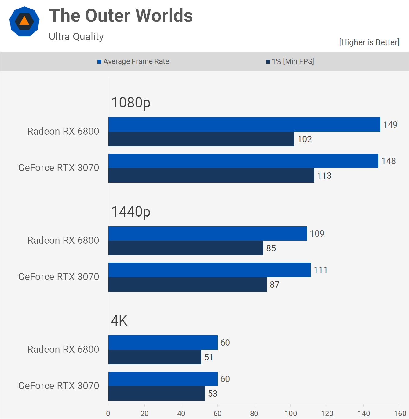 The RX 6800 struggles in The Outer Worlds. Performance isn't bad by any means, but unlike other games where it typically beats the RTX 3070, here it's at best able to match the GeForce GPU. Historically this hasn't been a great title for AMD, so these results should not surprise anyone.