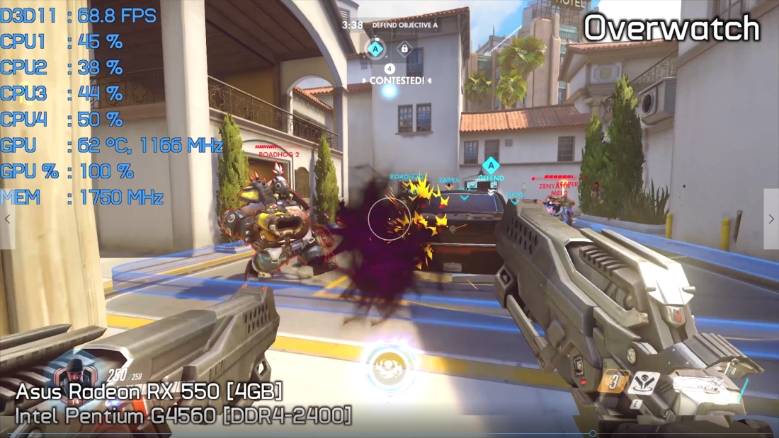 For Overwatch we used the medium quality settings at 1080p and ran a 12-player bot match. Bot matches are generally a bit more demanding on system resources than online multiplayer with human players. Gameplay was extremely smooth with around 60fps for the most part during the heavy battles.